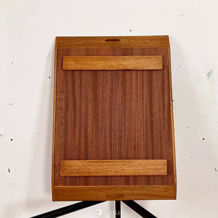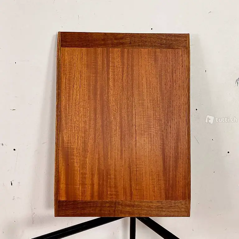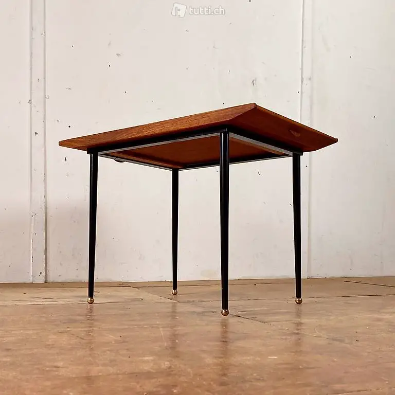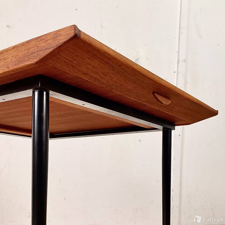 Kleiner Teak Salontisch mit abnehmbaren Serviertablett. 63.5x46.5cm Höhe 45cm. Das schwarz lackierte Tischgestell, mit konischen Rundbeinen und Messing Kugel-Abschlüssen, kam ohne Tischblatt zu uns. Das abnehmbare Serviertablett wurde von uns, aus altem Teakholz Material, frisch zusammen gestellt. Das Tischblatt ist mit Teak furniert, die leicht erhöhten Kanten sind aus Vollholz. Die rechteckige Grundform wurde so gewählt, dass der Tisch an den längs Seiten, samt Gestell gut getragen werden kann. Als Serviertablett hat es Stirnseitig kleine halbrunde Griffleisten. Die Eichenholz Leisten auf der Unterseite passen ins Metall Profil.