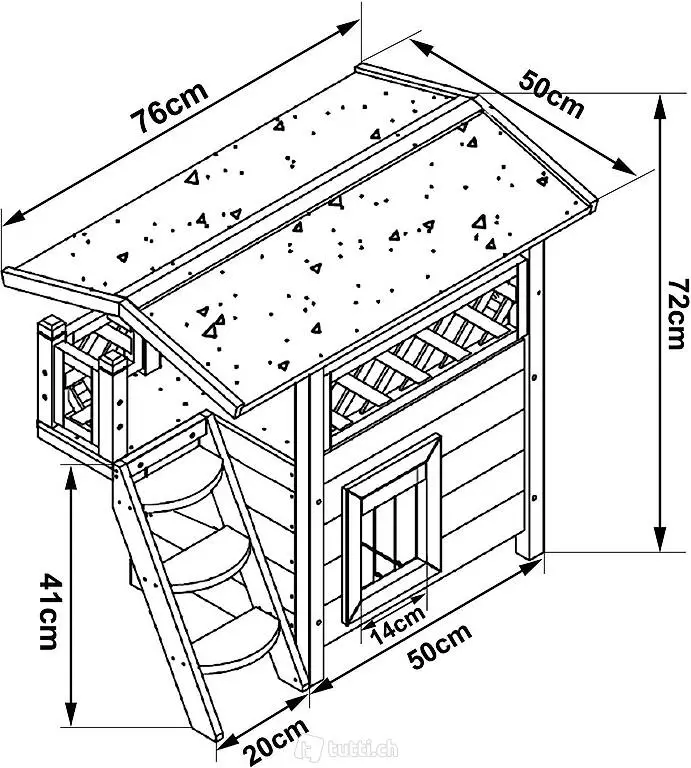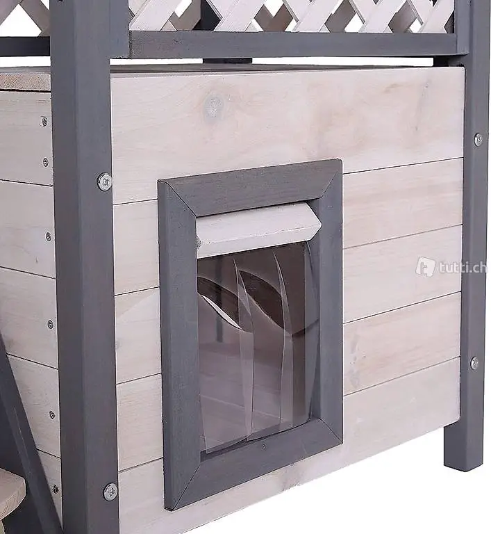 Stilvoll und zugleich gemütliches Katzen-Holzhaus mit Veranda, Masse 77 x 50 x 73 cm (siehe Skizze)