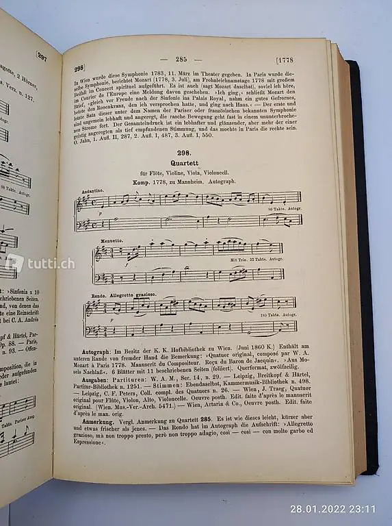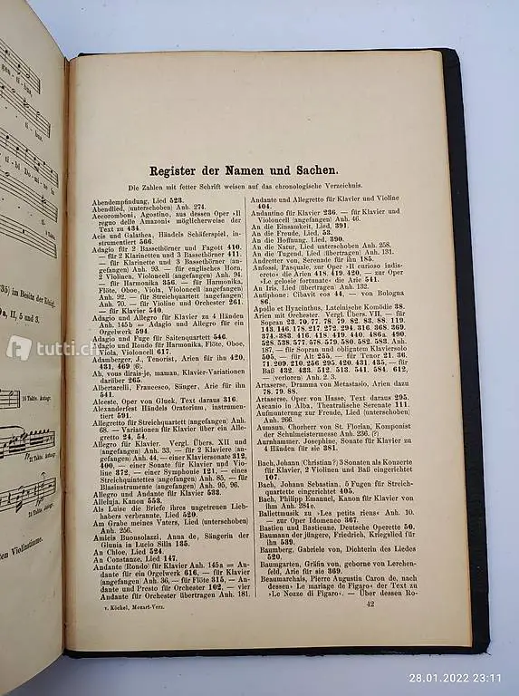 Ritter von. Chronologisch-thematisches Verzeichnis sämtlicher Tonwerke. Wolfgang Amade Mozarts. Nebst Angabe der verloren gegangenen, angefangenen, übertragenen, zweifelhaften und unterschobenen Kompositionen desselben. Zweite Auflage bearbeitet und ergänzt von Paul Graf von Waldersee. Leipzig, Beitkopf& Härtel, 1905. 25,5 x 18,5 cm. 676 S. Halbleinen-Einband der Zeit. - Aussen leicht berieben und schwach bestossen; erste Blatt etwas stockfleckig, ansonsten lediglich im Schnitt gebräunt.