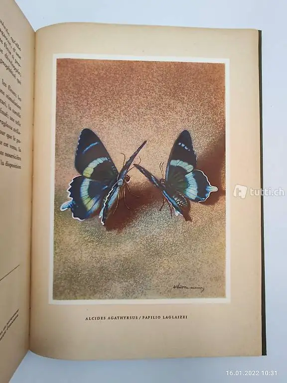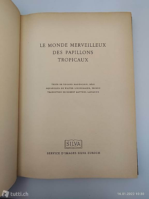 Linsenmaier, Walter - Handschin, Eduard. Le monde merveilleux des papillons tropicaux. Mit 48 montierten Tafeln nach Aquarellen von W. Linsemaier. Zürich, Service d'images silva, 1950. 30 x 21,5 cm. 102 S.Original-Leinen mit goldgeprägtem Rücken- und Deckeltitel. - MIT EIGENHÄNDIGER WIDMUNG VON WALTER LINSENMAIER AN PROF. DR. JACQUES DE BEAUMONT. - Ecken minimal bestossen; in den Rändern leicht gebräunt