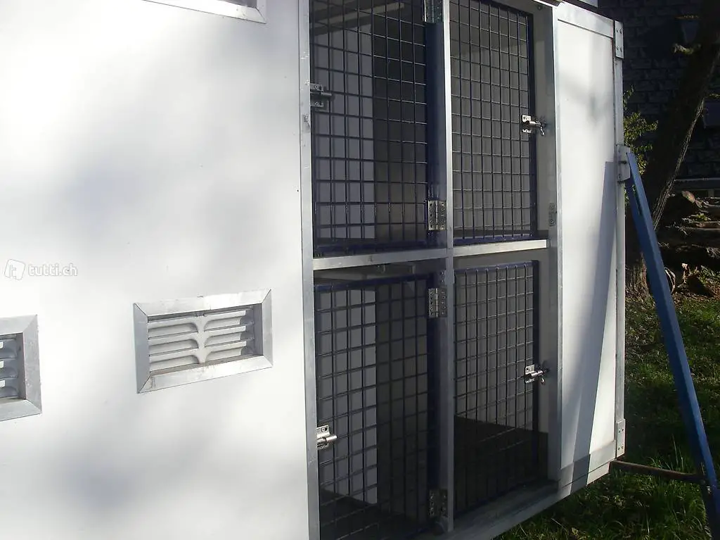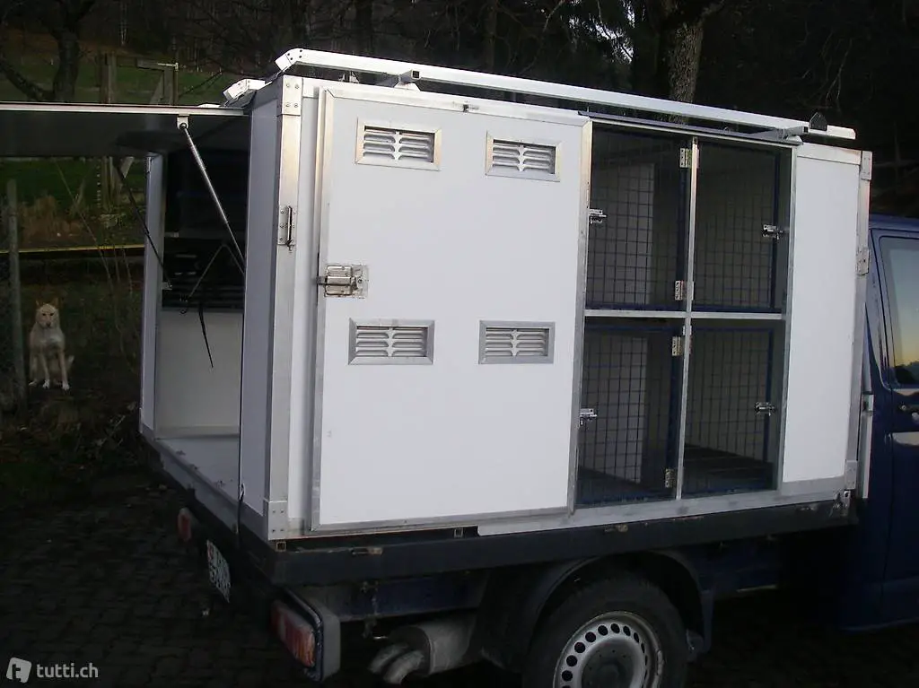 Stauraum hinten. Masse der Hundeboxen innen: 4x 90x77x58 cm unten und 4x 90x77x56 oben. Oben auf dem Dach können 2 Hundeschlitten mitgeführt werden.