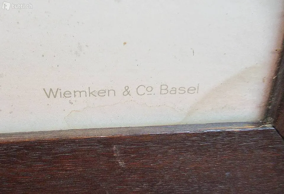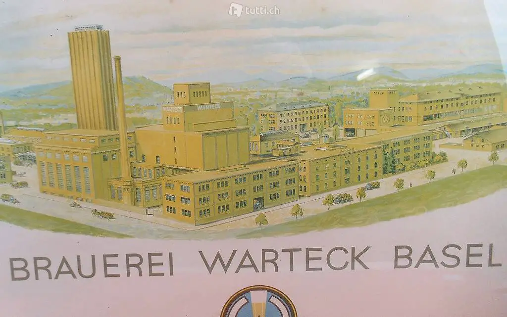 Altes Werbebild der Warteck Brauerei in Basel in einen verglasten Holzrahmen im guten Zustand. Das Bild und der Rahmen wurde nicht gereinigt. Hergestellt von Wiemken & Co. Basel. ca. 98 x 64 cm.