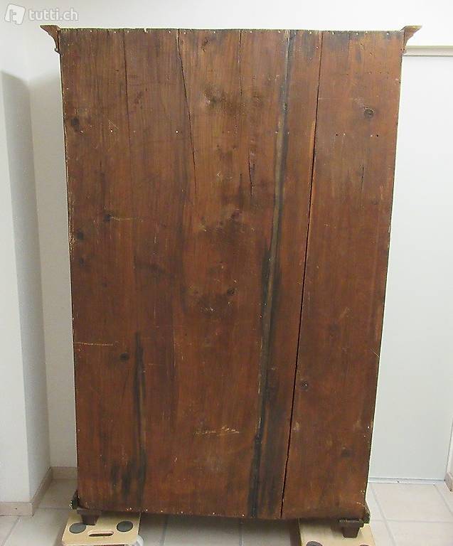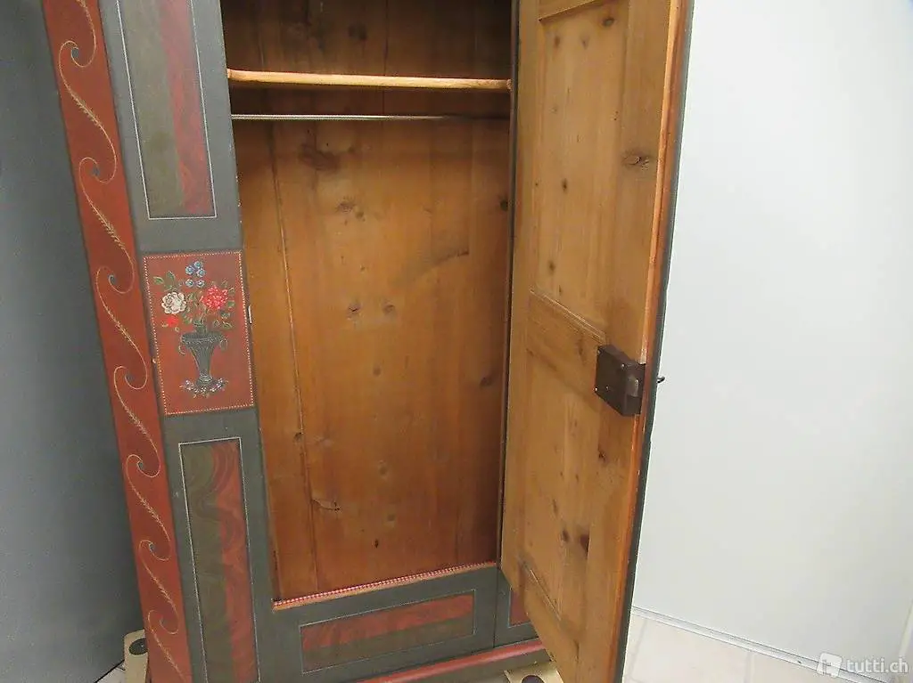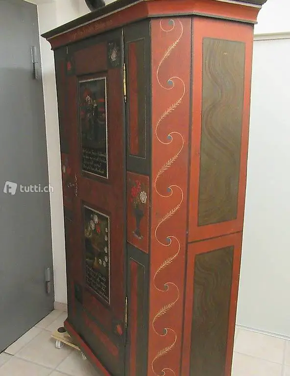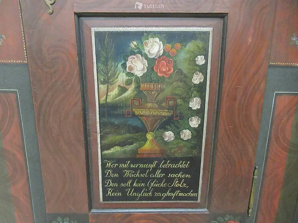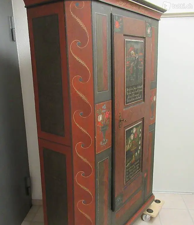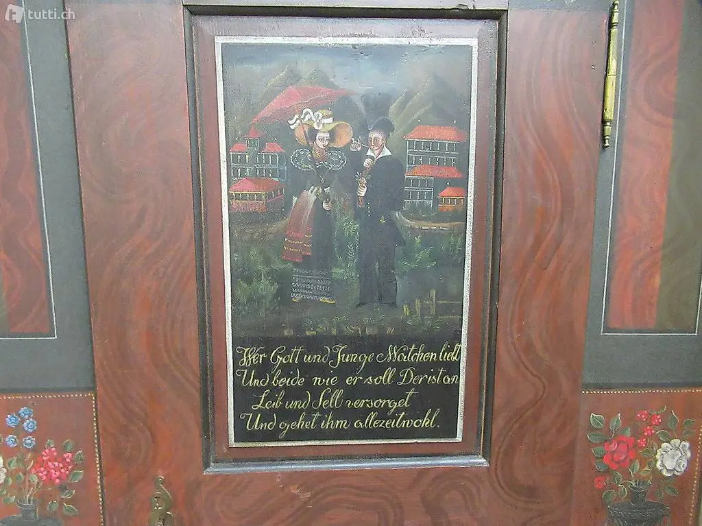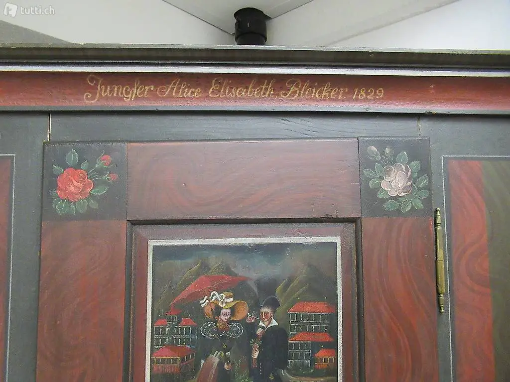 Schöner antiker Schrank aus Biedermeier Zeiten. bemalt im Stil der Hochzeitschränke. Da man davon ausgehen kann das die Jungfer Alice Elisabeth Bleicker im Jahre 1829 noch nicht verheiratet war, ist es leider auch keiner. Trotzdem in guten Zustand mit originalen Malereien und nur wenigen kleinen Beschädigungen. Bitte bedenken Sie das dass ein Teil der schweizer Geschichte ist und zum ablaugen zu schade ist. Masse am Kranz gemessen. 125 x 48 x 188 cm.