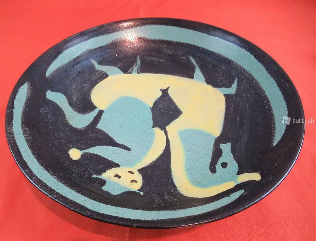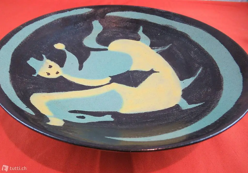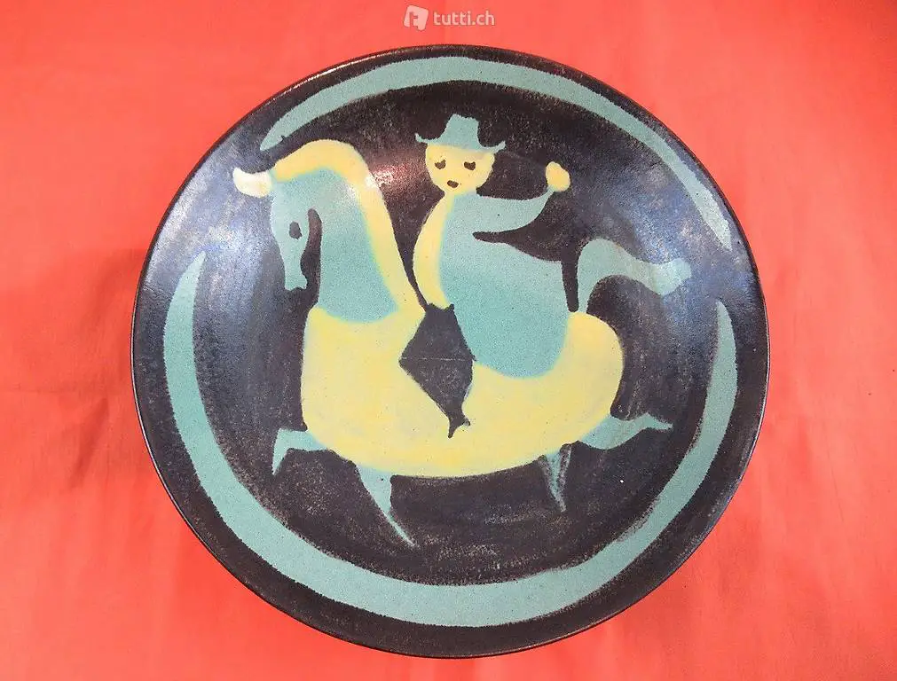 Schöner und einzigartiger Teller aus gebrannten Ton. Naive Malerei eines Reiter. Leider ist der Künstler bzw. Hersteller nicht bekannt. Masse ca. DM 27 cm x 6 cm hoch.