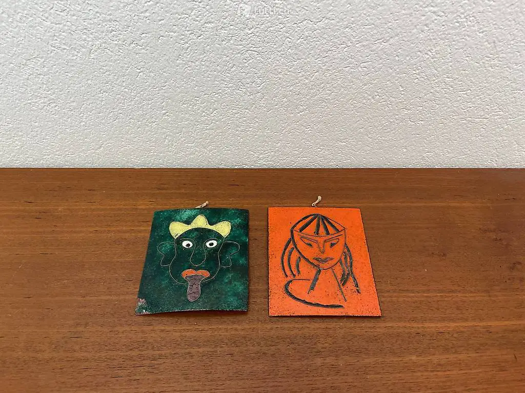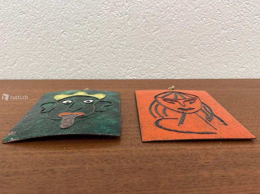 Kunstwerke aus Emaille auf Kupfer. Die kleinen Bilder / Gemälde eines stereotypen Afrikaners und eines Asisten wurden vermutlich in den 1950er oder 1960er Jahren hergestellt. Die kleinen Wandbilder bestehen aus einem Kupfer Blech mit darauf aufgebrachten Trennlinien, welche die Felder für die verschiedenfarbige Glasschmelze begrenzen. Die 50s 60s Bilder wurden von Hand gemalt. Die asiatisch inspirierte Emaillemalerei ist in sehr gutem Zustand, beim afrikanischen Bild ist die eine untere Ecke beschädigt. Die beiden Kupferbilder verfügen über eine Aufhängevorrichtung auf der Rückseite.