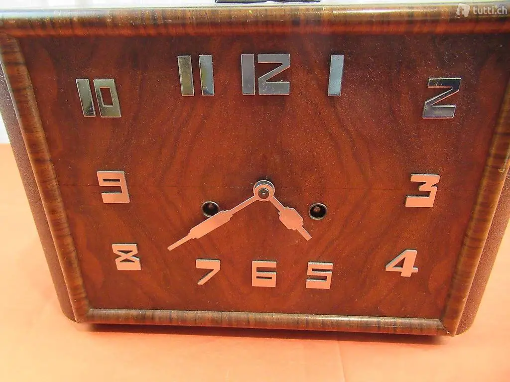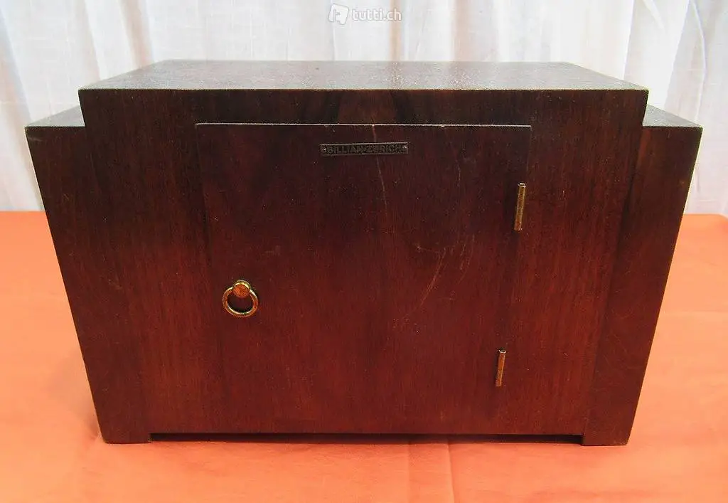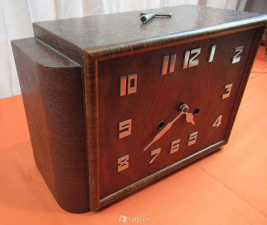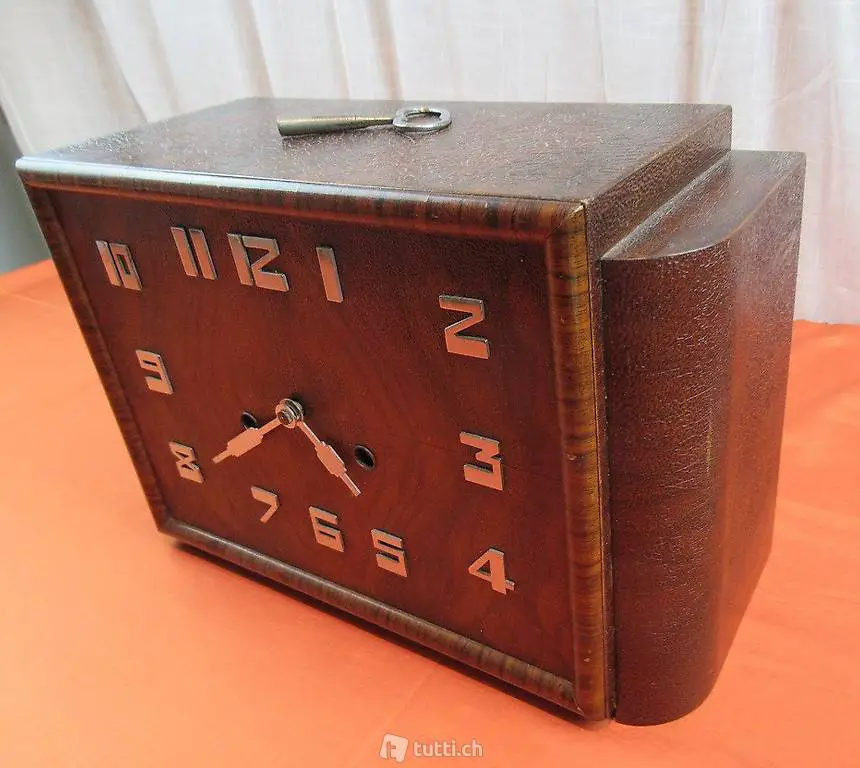 Sehr schöne und gut funktionierende Uhr im Art Deco Stil mit einen Junghans Uhrwerk. Auf dem Gehäuse hat es einen Messing Platte mit der Aufschrift Billian Zürich. Billian war ein Juwelier in Zürich der Neben Schmuck auch Uhren vertrieb. Die Uhr schlägt zur halben und vollen Stunde.
