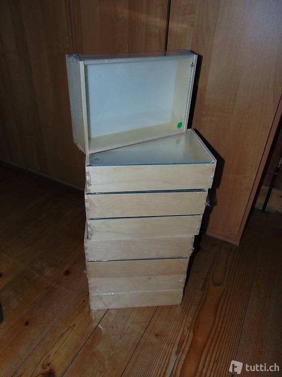 Verkaufe 8 Stück Neue und Originalverpackte Sammelboxen / Holzboxen ... mit Frontseitigem Schiebeglas und 2 Aufhängevorrichtungen hinten. Das Holz ist Natur und unbehandelt! Die Innenmasse der Boxen sind 29 x 18.5 cm und ca. 6 cm Tief. Die Boxen stammen von der IKEA - Typ BAS mit der Artikelnummer 865.253.09. Der Preis ist für alle 8 Boxen zusammen. Die Boxen kann man in 9443 Widnau oder 9436 Balgach abholen kommen.