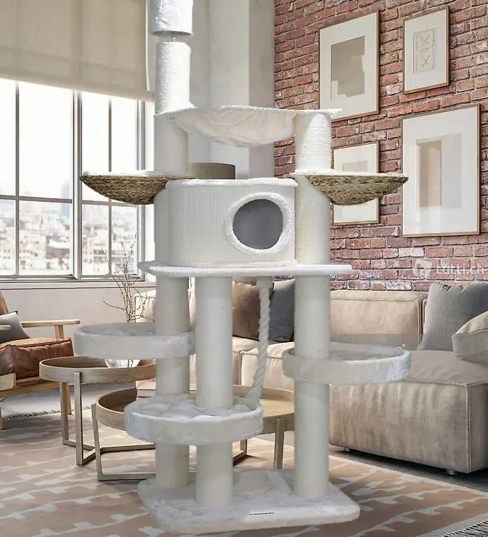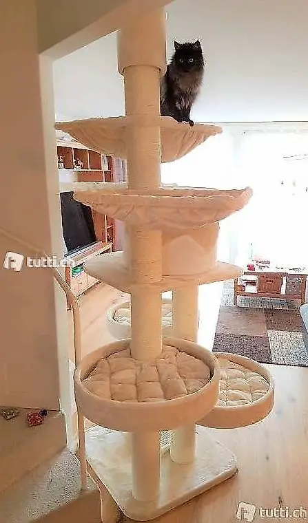 Katzenbaum aus robusten Materialien - extra verstärkten Sisalstämmen mit einem Durchmesser von 16 cm Ø, doppelt genähtes sowie gestepptes Plüsch + echten Naturliegekörben mit