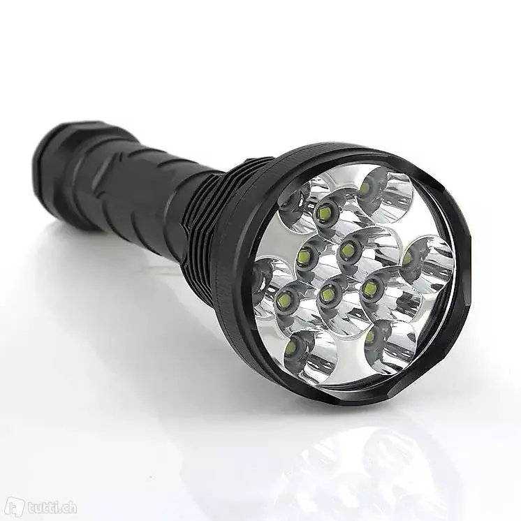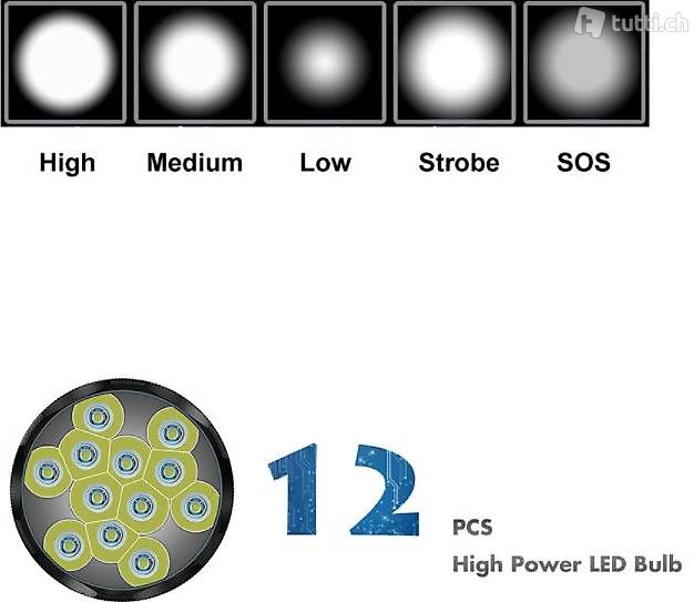 Superhelle 12x Bulb T6 LED-Taschenlampe und 5-Modi-Design: hoch, mittel, niedrig, Stroboskop und SOS.