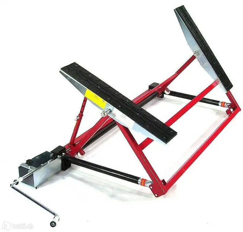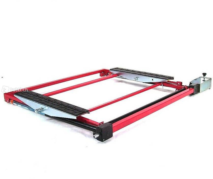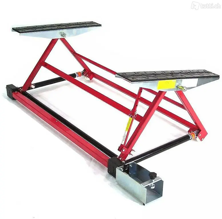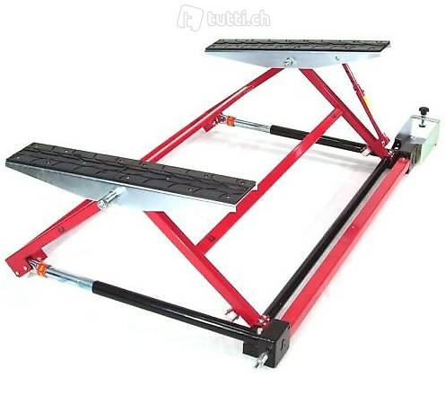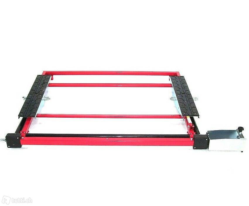Dabei kann die flache Hebebühne unter das Fahrzeug gerollt und manuell mittels Gewindekolben mechanischen angehoben werden,