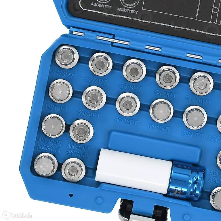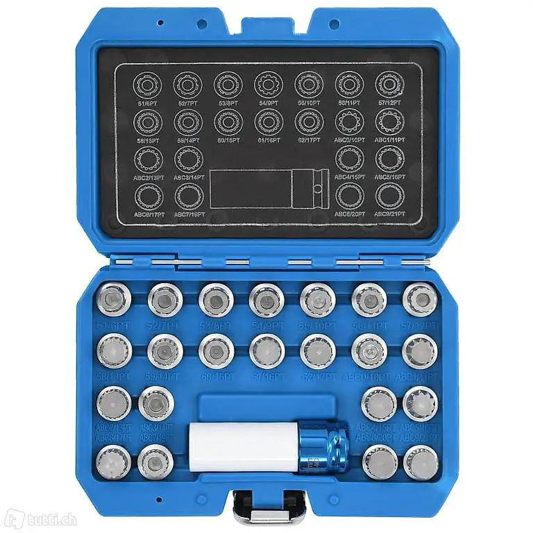 Dieser 23-teilige Felgenschloss-Demontagewerkzeug-Satz enthält 22 Felgenschlosseinsätze in verschiedenen Grössen und 1 Kraftstecknuss. Es dient zum Entfernen oder Installieren der Felgenschlösser bei den meisten VAG Fahrzeugen. Diese aus Chrom-Molybdän-Stahl gefertigten Werkzeuge sind äusserst robust und langlebig. Alle Teile werden in einem praktischen, blasgeformten Koffer zur einfachen Lagerung und zum
