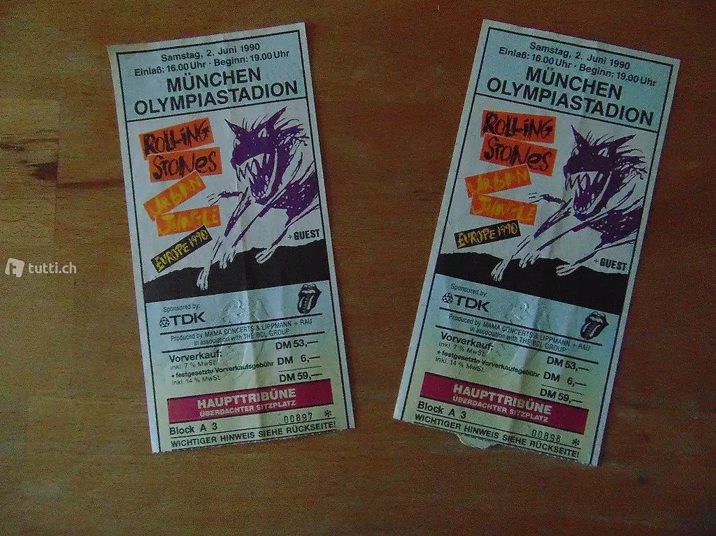 Rolling Stones Urban Jungle Tour 1990 ein sehr schön erhaltenes Programm Book inklusive 2 Tickets vom Konzert am Samstag 2. Juni 1990 im Olympiastadion in München. Das Programm Book hat die Abmessung h x b von 35 cm x 27.5 cm und in der Mitte lassen sich die Seiten aufklappen (Bild Nr. 3) . Das Book und die 2 Tickets sind Sammlerstücke für einen Fan oder Liebhaber und sind in der Schweiz kaum zu bekommen! Das Book und die Tickets können auch gerne unverbindlich in 9436 Balgach angeschaut werden. Abholung oder Versand per Post (Porto 10.-- Franken und nur gegen Vorauszahlung) .