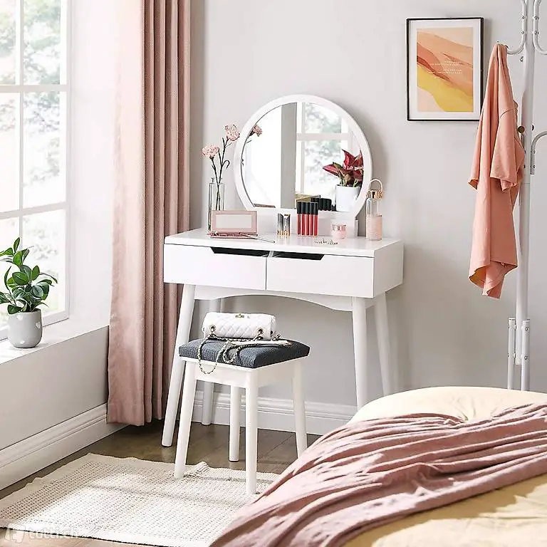 Schubladen mit Schienen, Kosmetiktisch mit rundem Spiegel und Hocker, frisiertisch Frisierkommode weiss, Holz