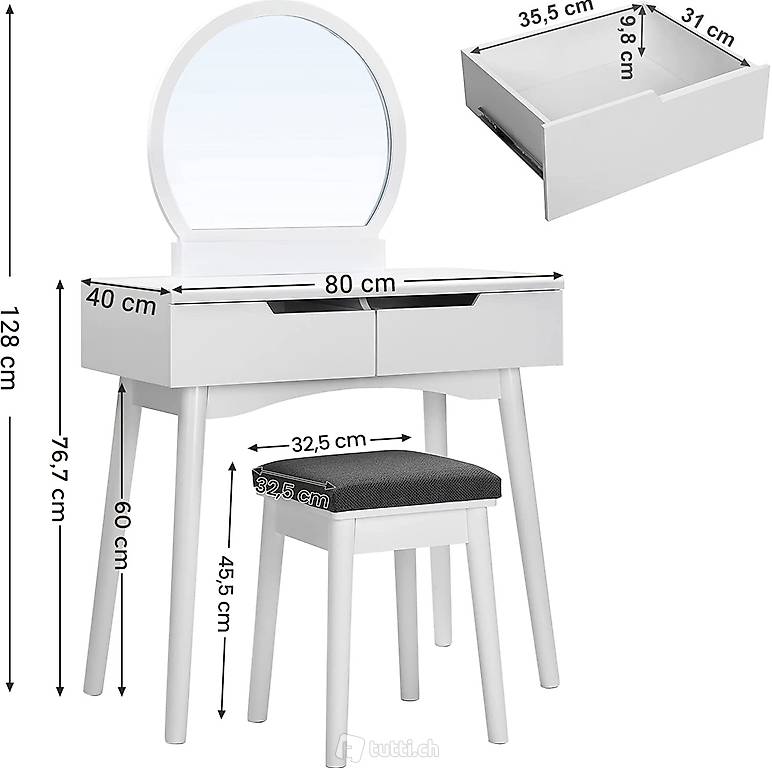 Masse: 80 x 128 x 40 cm (Schminktisch) ,32,5 x 45,5 x 32,5 cm (Hocker)