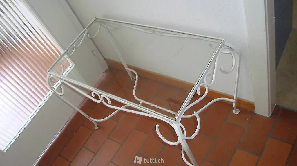 Tisch / Pflanzentisch / Glastisch: Gestell weiss aus Metall mit Glasplatte. 65 x 35 cm, Höhe 48 cm mit etwas Gebrauchspuren. Auch süss als Beistelltisch / Couchtisch / Salontisch / Clubtisch. Passt zu shabby chic und Landhaus Stil.
