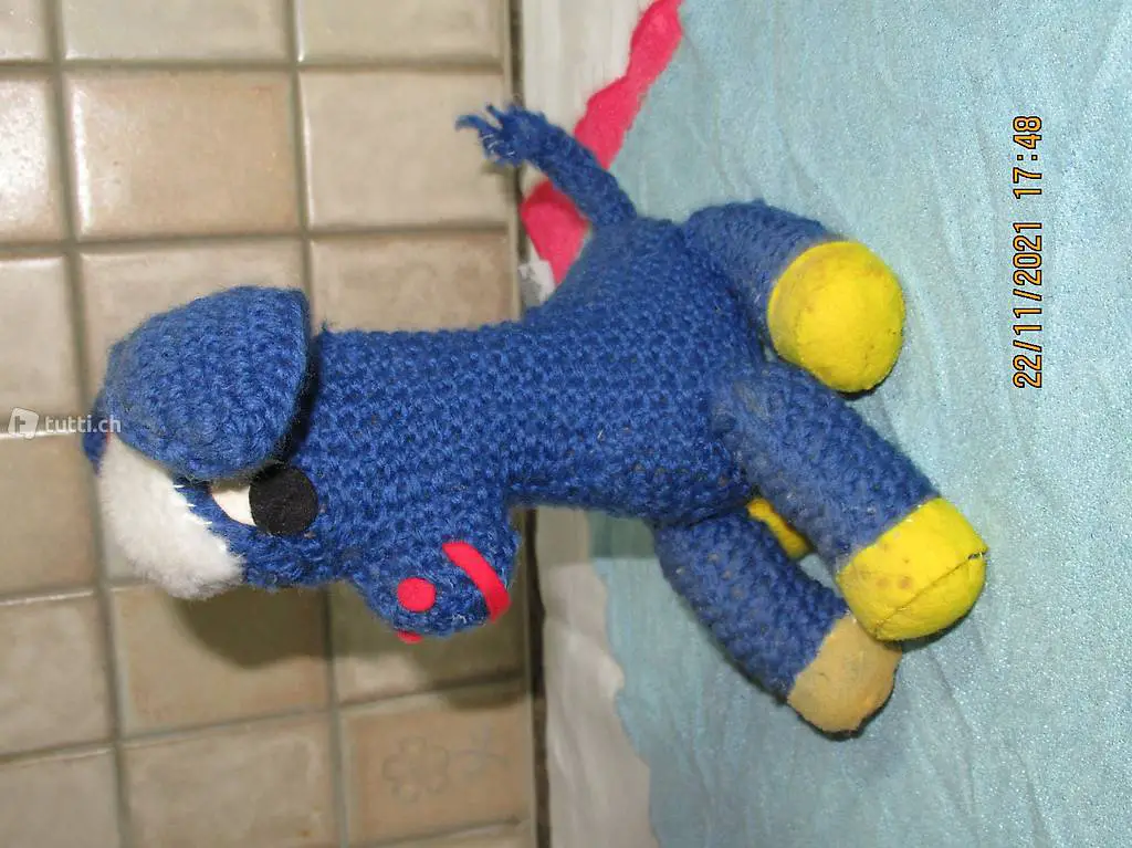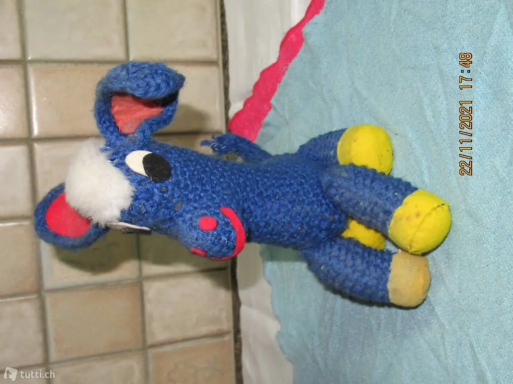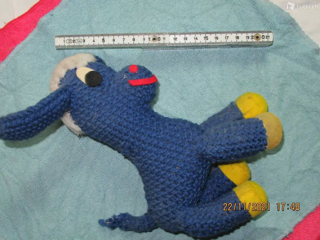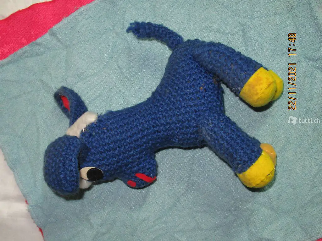 Esel gestrickt, der sich heute noch sehen lässt, hat durch das Alter einige Blessuren, aber immer noch liebevoll, und für begabte Strickerinnen ein Teil zum NACHAHMEN