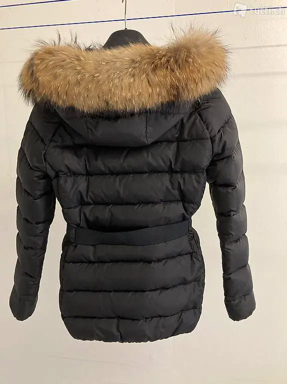 Reissverschluss, Knopfleiste mit 4 grossen MONCLER Knöpfen, 2 Taschen mit Reissverschluss, 2 Brusttaschen mit je 2 Druckknöpfen zum verschliessen, eine Kapuze mit Kordelzug und abnehmbarem Fellkragen, 1 elastischer Gürtel (b 4cm) mit Klick- und Patentverschluss aus Metall und MONCLER Schriftzug, Ersatzknöpfe vorhanden, die