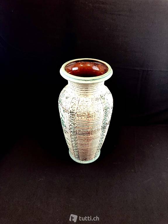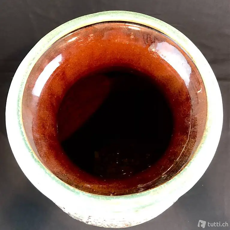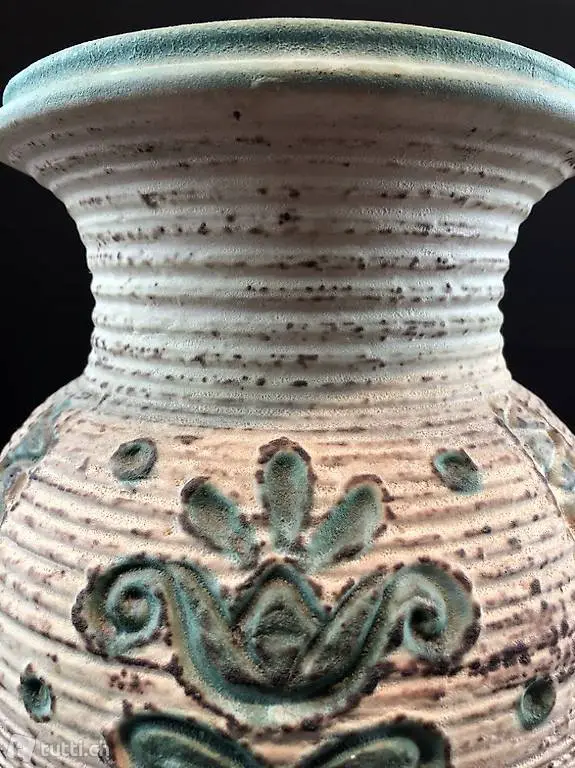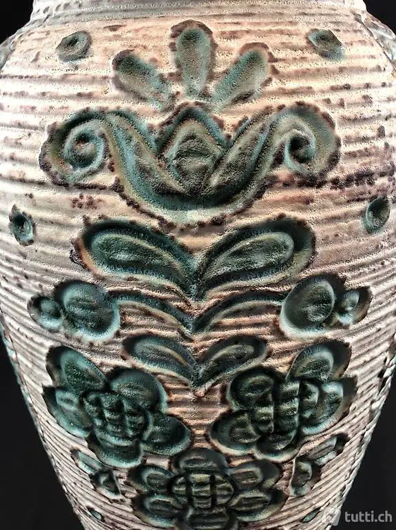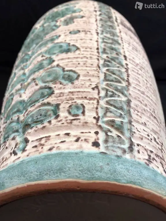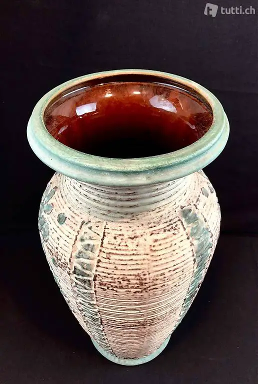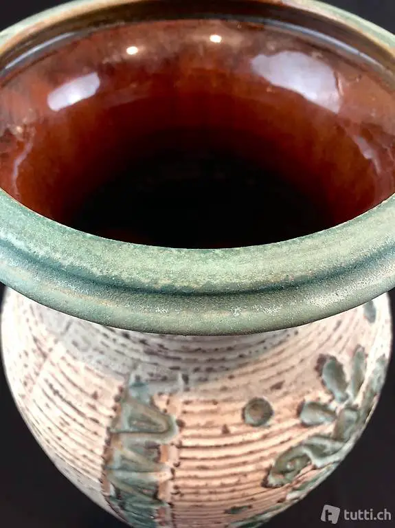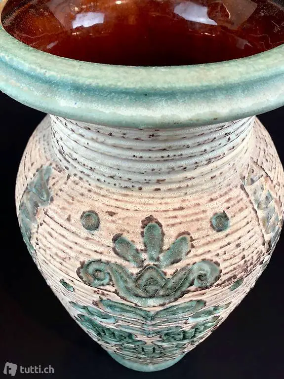 Schöne grosse handbemalte Bodenvase aus teilweise glasierten Keramik aus Österreich im guten Zustand ohne Beschädigungen. Durchmesser 23 cm und ca. 31 cm hoch.