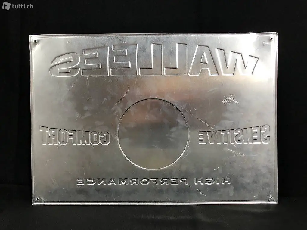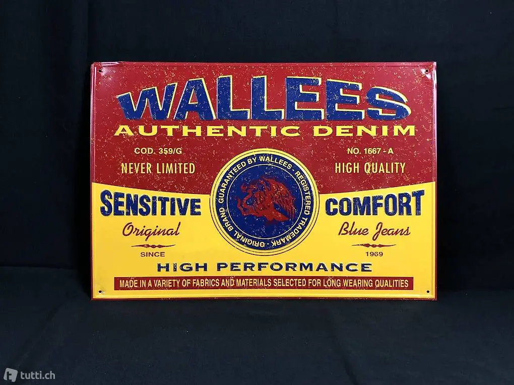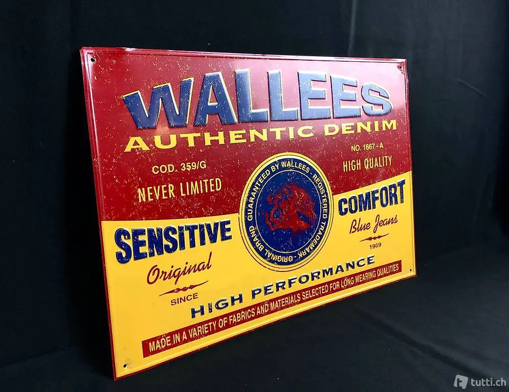 Gut erhaltenes Werbeschild der Jeansmarke Wallees aus gestanzten Blech. 40 x 27,5 cm.