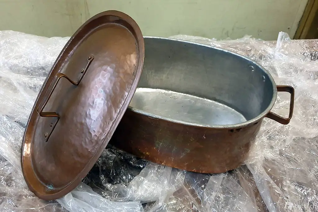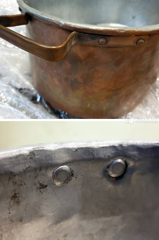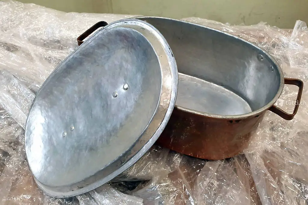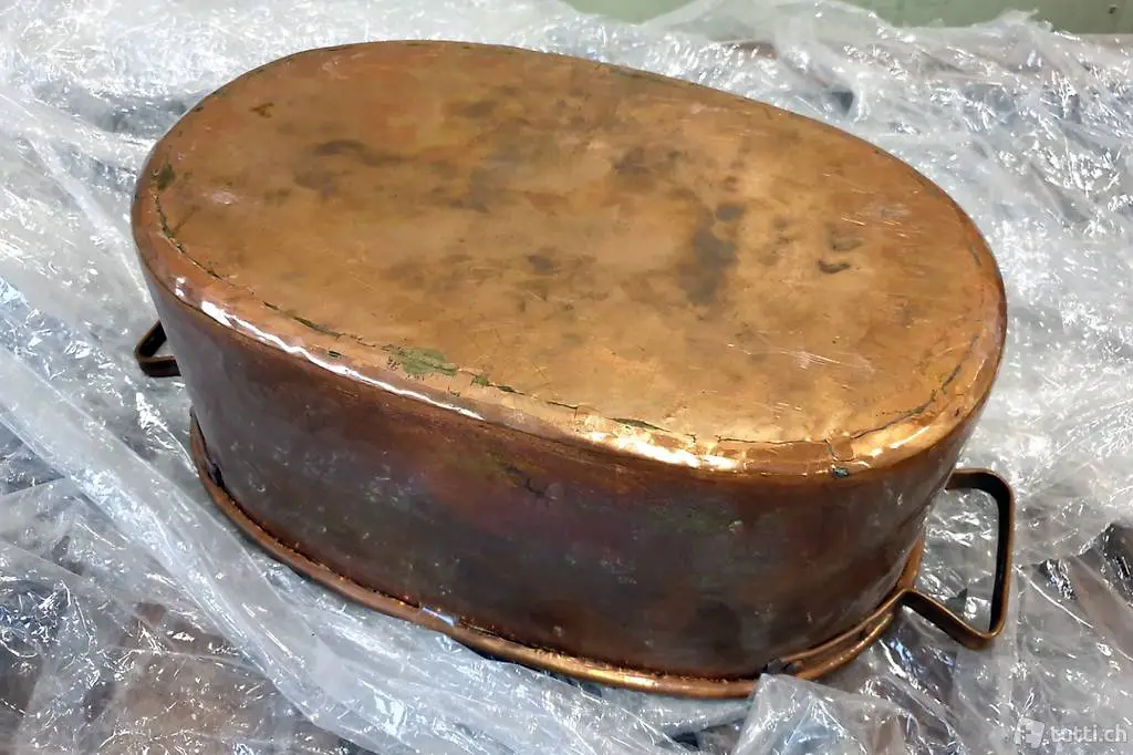 Das Alter des schönen Kupfer Bräters ist nicht bekannt. Es wird aber mehr als 25 Jahre sein. Trotzdem ist der Bräter noch immer funktionstüchtig, d.h. durch die innere lebensmittelkonforme Beschichtung, lassen sich wunderbare Gerichte (zarter Braten usw) herzaubern.