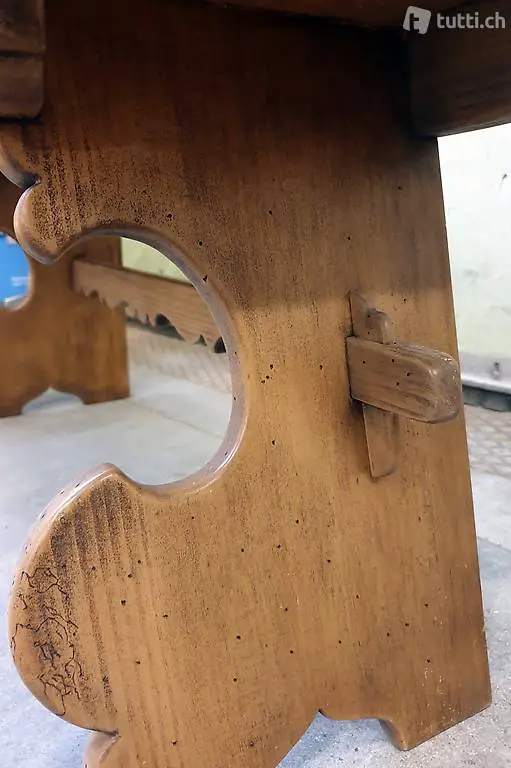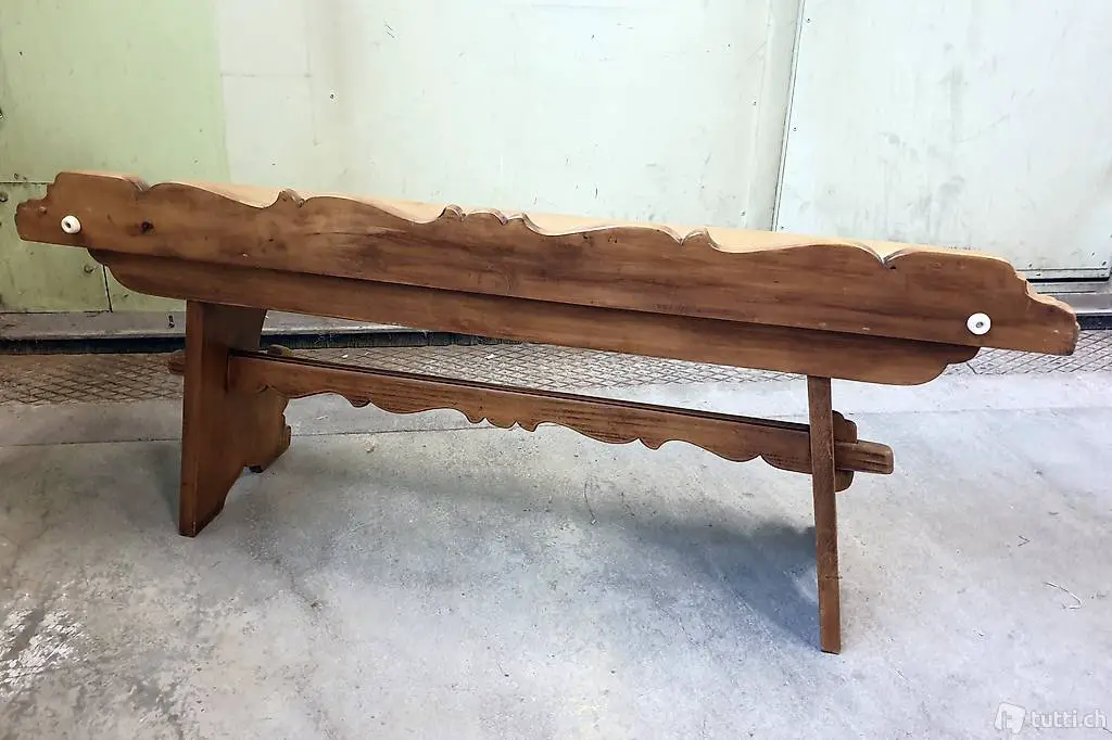 Sitzbank ist ungefähr 50 Jahre alt. Das hintere schmale Rückteil und die unter der Sitzfläche angebrachte Holzstrebe sind geschnitzt.