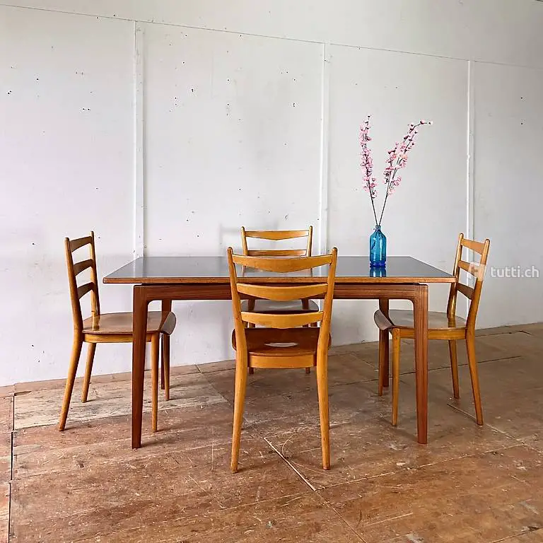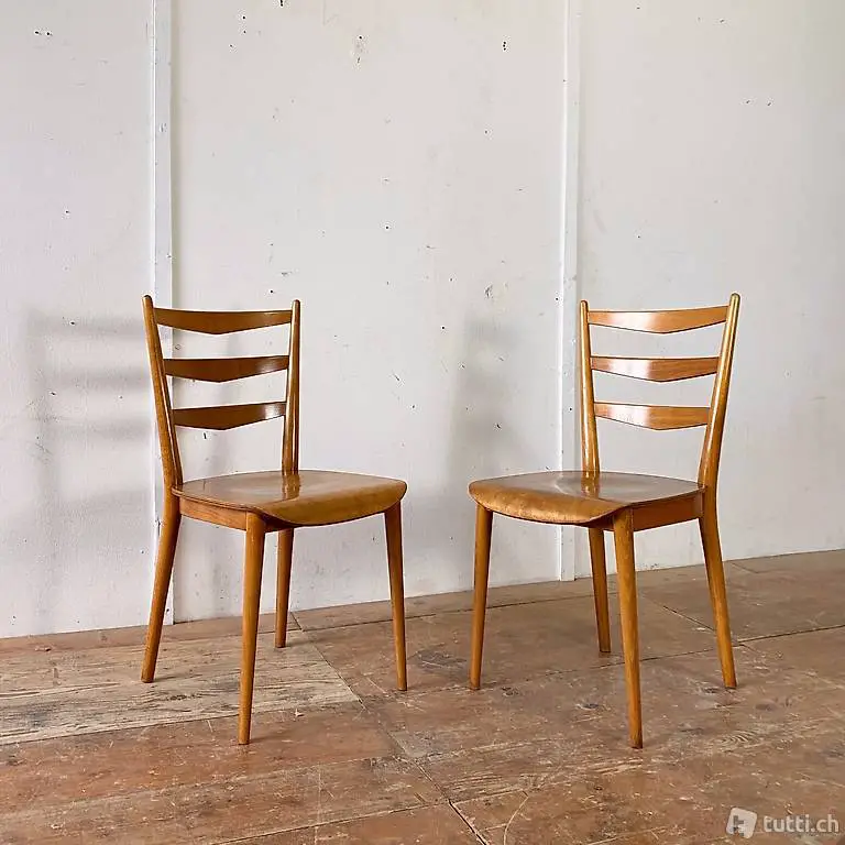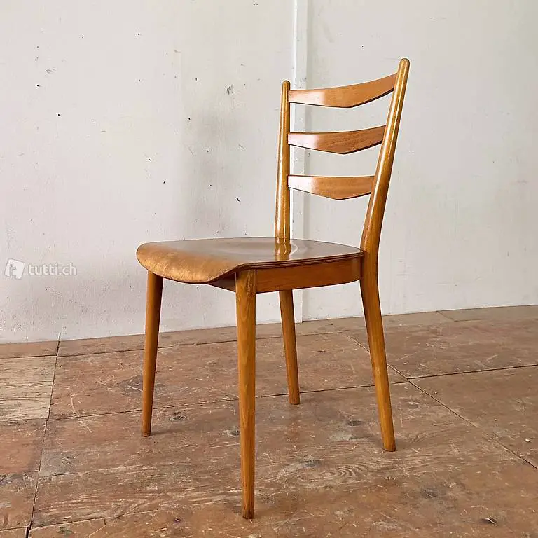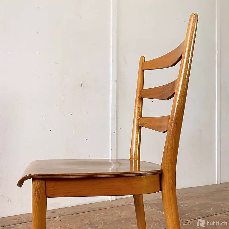 4er Set Horgenglarus Stühle Jahrgang 1964. Die Esszimmer Stühle sind in gutem stabilen Original Zustand. Die konischen Rundbeine und die Rücken Sprossen sind Dampfgebogen. Die Sitzfläche, mit Mulde, ist aus Birkensperrholz formverleimt. Weitere Möbel vorhanden.