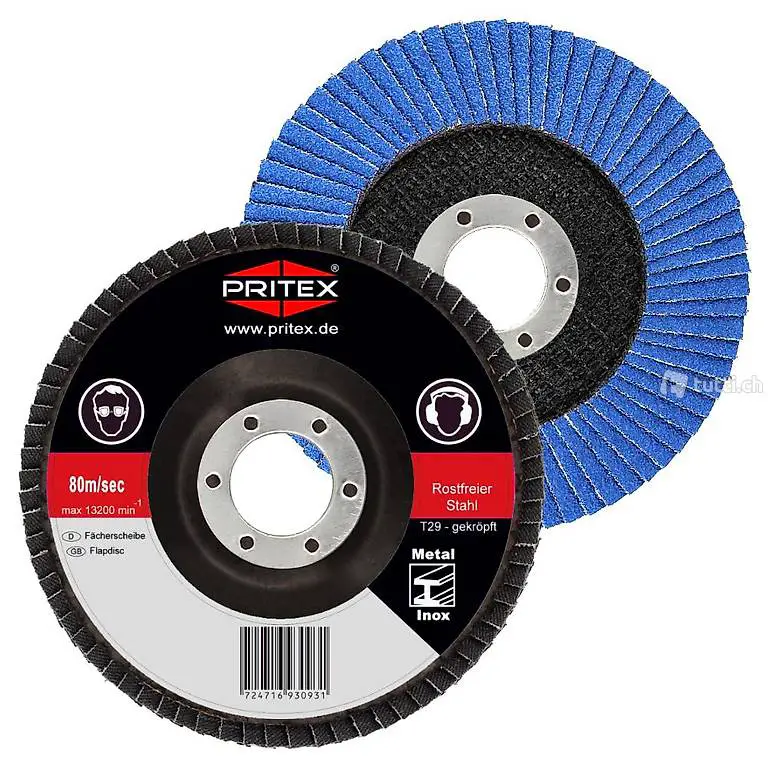 Die PRITEX Fächerscheiben, mit einen Durchmesser von 125 mm, sind zum Schleifen von verschiedenen Werkstoffen geeignet. Der Fächerscheibe ist um 12° gekröpft (T29) , dies ermöglicht ein genaueres abtragen.