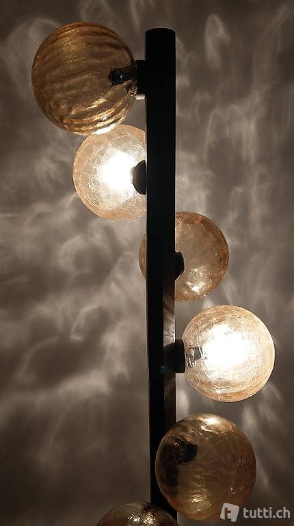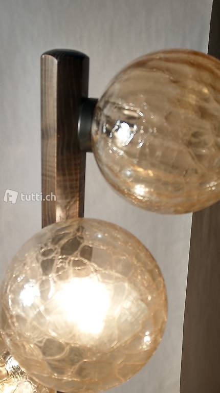 holz mit 6 leicht golden schimmernden krinkelglaskugeln. beleuchtet mit betörendem schattenspiel.