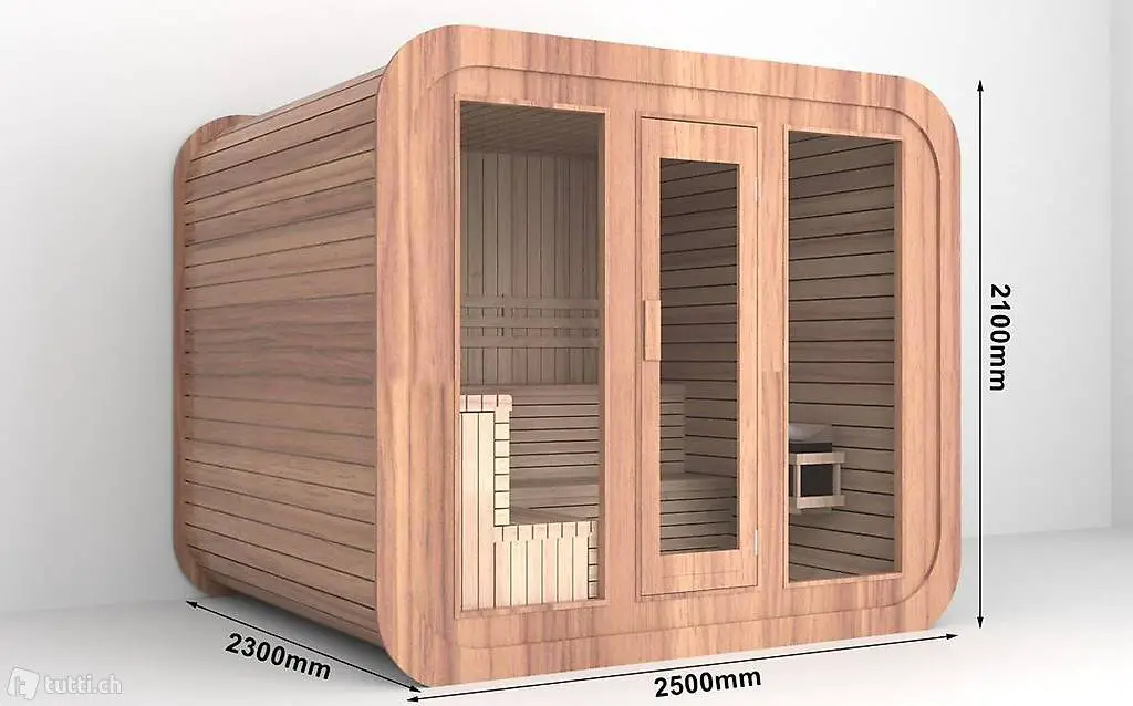 Tiefe 2.30m | Breite 2.50m | Höhe 2.10m | Aussenmasse | Gewicht ca. 1000kg | Panorama Fenster | Red Cedar Zedernholz | 9.0 kW Ofen | Wasserfestes Dach | Thermometer, Eimer und Löffel |