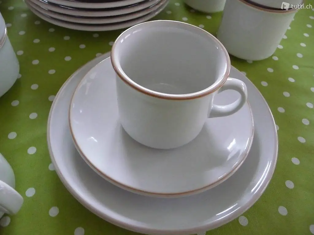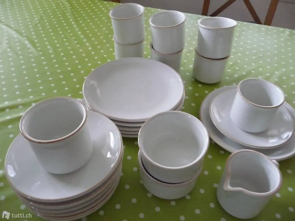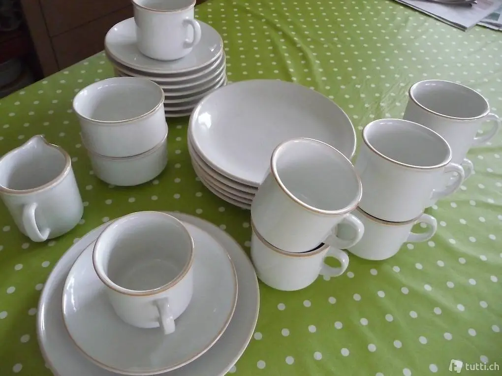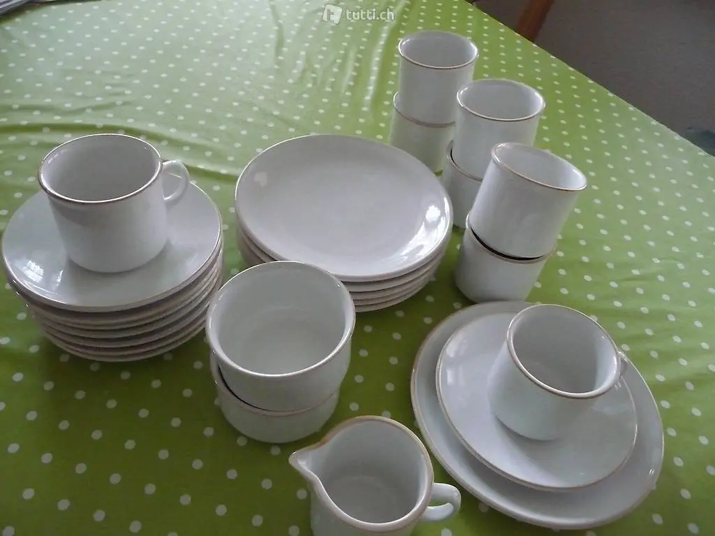 8 Tassen mit Unterteller, 6 Dessertteller, Rahmkrüglein, 2 Schäli für Zucker oder Konfitüre.