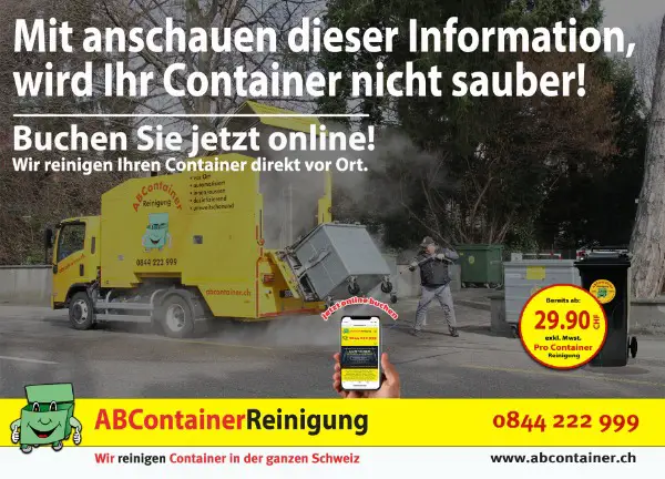 Wir reinigen und desinfizieren sämtliche Container in der Schweiz, mit unserem CLEANMOBIL direkt vor Ort! Bereits am 29.90 CHF! Wenn wir Ihren Container noch nicht reinigen, so buchen Sie direkt unter www.ABContainer.ch Ihre passende Containerreinigung.