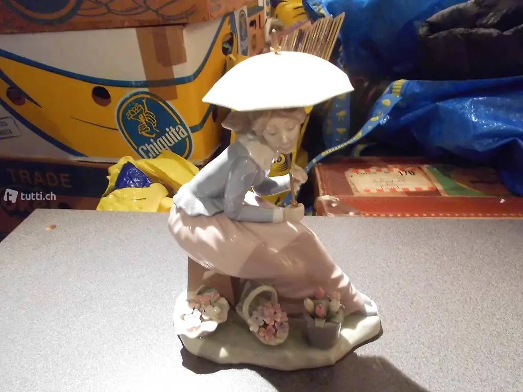 Porzellanfigur Mädchen mit Blumenkörbe und Schirm Lladro