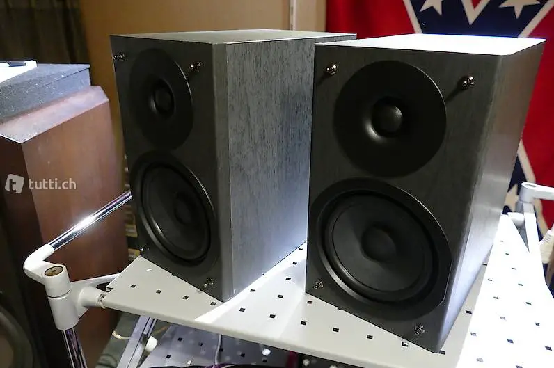 Regallautsprecher in fast perfektem gutem Zustand, Baujahre ca.? , in der Farbe Holzfurnier dunkel, Made in Malaysia.