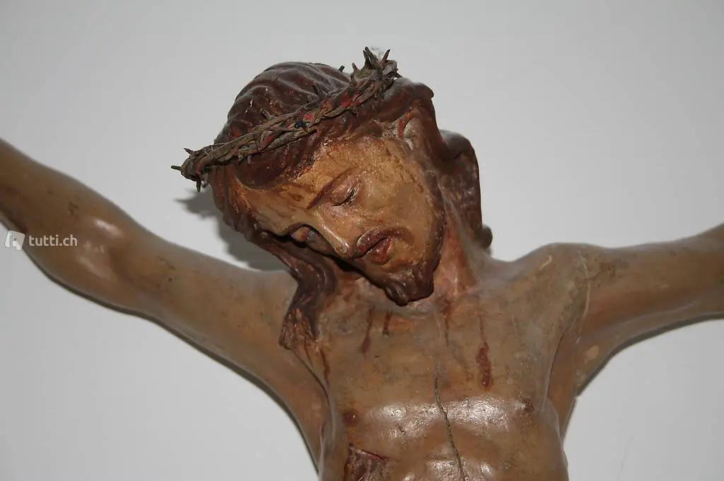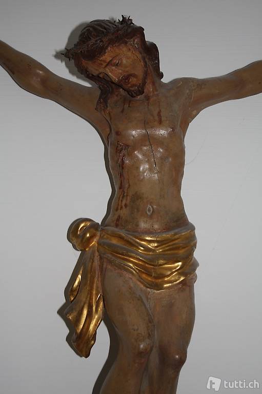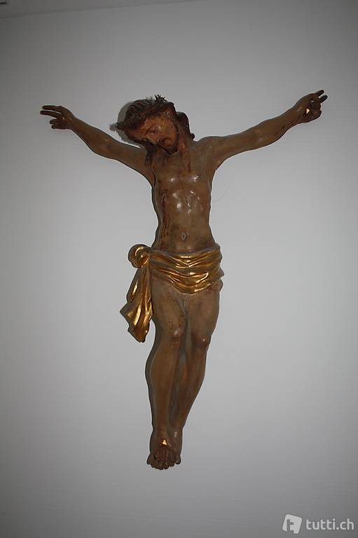 Holz bemalt mit Lendentuch vergoldet. Der Erhaltungszustand ist sehr gut. Die Figur wurde 1984 sanft renoviert. Die Herkunft ist vermutlich Süddeutschland. Höhe: 68.5 cm. Die Länge über die ausgebreiteten Arme beträgt 77 cm. Der Kaufpreis betrug im Jahr 1984 bei Paul Döbeli