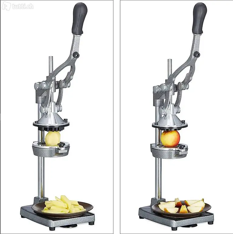 Zitruspresse hat 2 weitere Aufsätze - Der praktische Entsafter kann so auch als Pommesschneider und Apfelschneider verwendet werden