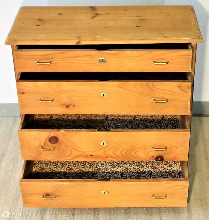 Frisch restaurierte Tannenholzkommode mit 4 Schubladen und Goldbeschläge.