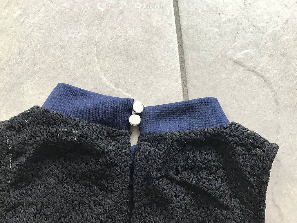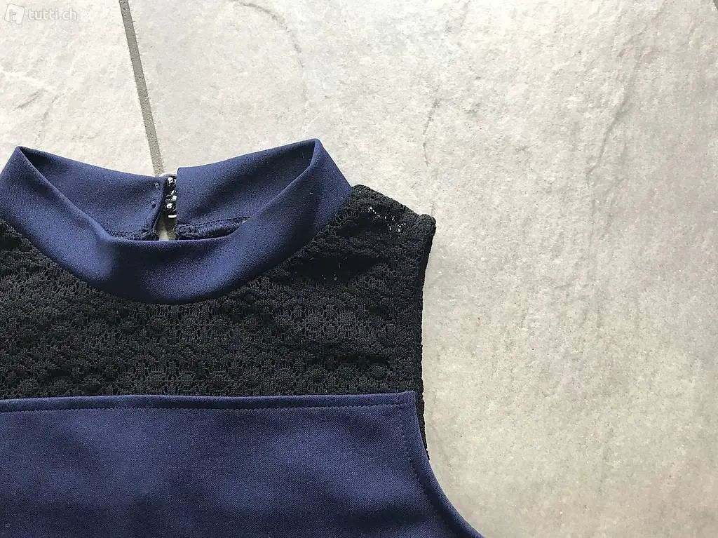 ärmellos, Farbe dunkelblau mit schwarzer Stickerei oben. Rückseite mit 2 silberfarbenen Knöpfen. Aus angenehmem, festenStretch-