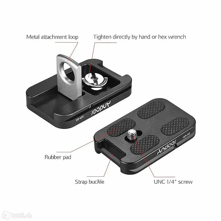 Als Schnellwechselplatte mit 1/4"-Schraubhalterung können Benutzer verschiedene Kameras schnell und einfach anbringen oder von einem Stativ oder Kugelkopf nach Arca-Swiss-Standard entfernen.