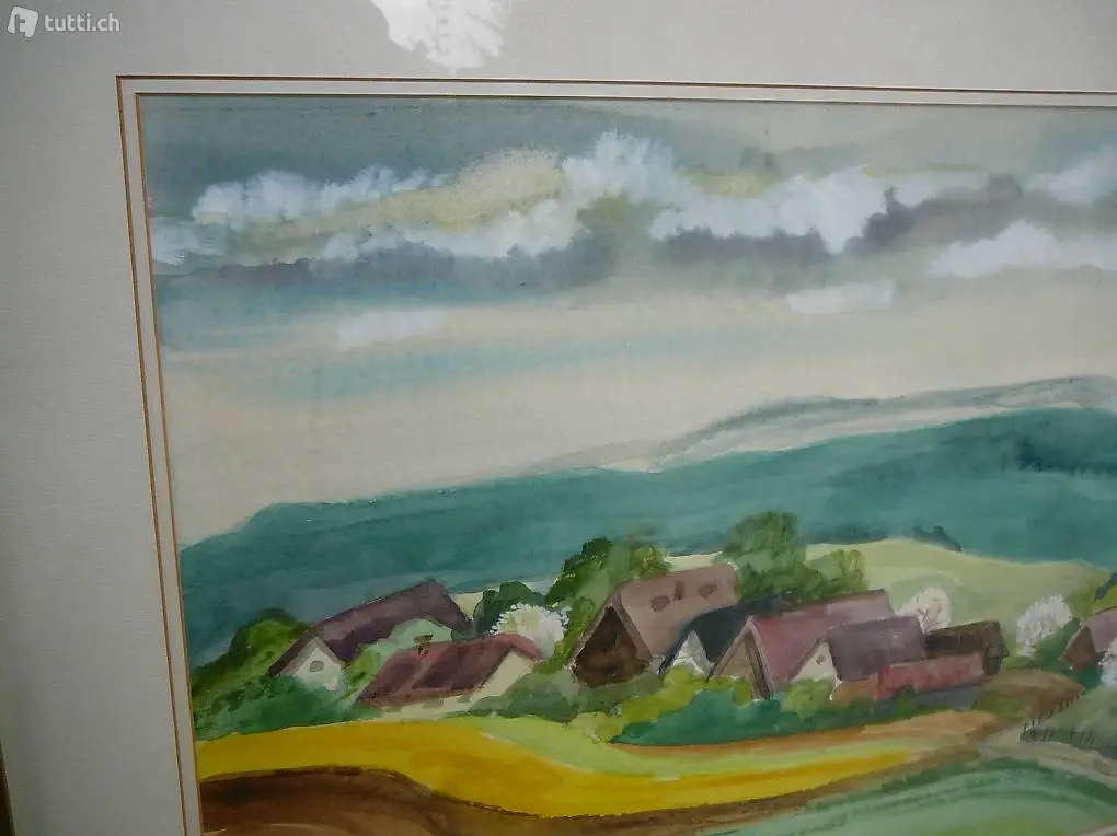 Schönes Bild mit Landschaft und schönem über Eck vergoldetem Rahmen.