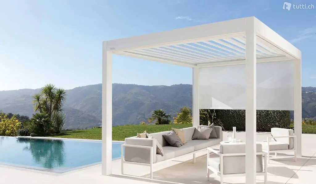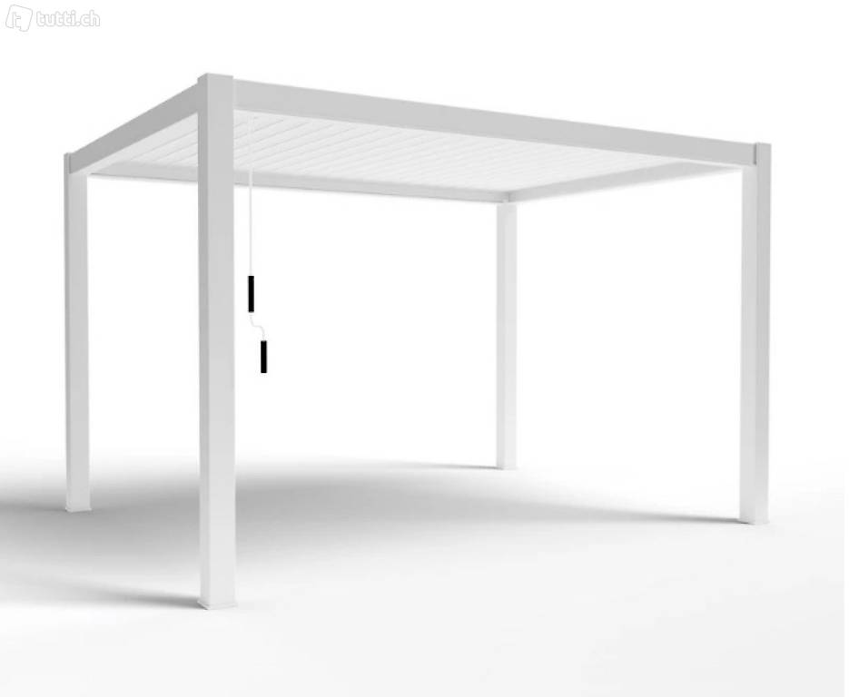 Pergola Pacific 300x300 weiss. Pulverbeschichtetes Aluminium (Polyester) . Tragestützen 11x11cm, Querstreben 14x7,5cm. Lamellendach mittels Kurbel verstellbar. Doppellagige Sonnenschutzlamellen 17x3cm. Wasserablaufsystem in den Tragestützen integriert.