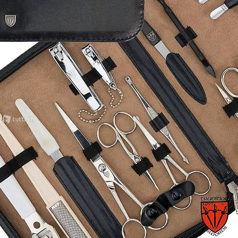 Hautschere, Nagelschere, Hautzange, Nagelzange, Pinzette schräg, Pinzette gerade, Pinzette spitz, Saphirnagelfeile (grob/fein, Drücker / Reiniger/Kratzer, Doppelinstrument, Nagelhautentferner, Nagelreiniger, Komedonenquetscher, Nagelknipser, Fussnagelknipser, Saphir-Formfeile, Hornhauthobel, Hornhautraspel, Haarschere, Nasenschere, Stickschere