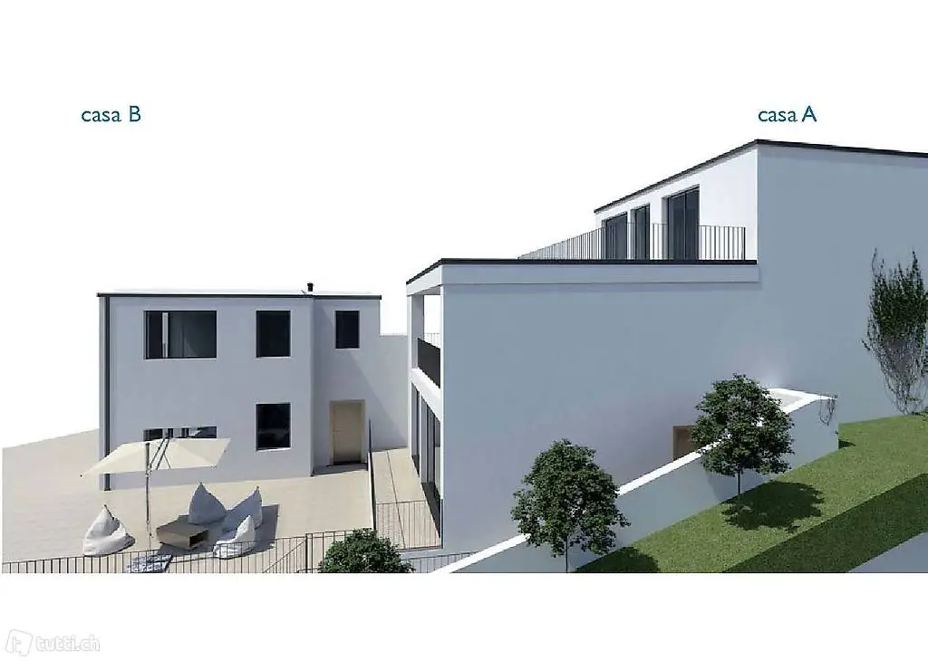 CASA 1 (A) : 5 ½ loc. di ca. 258 mq, con soggiorno-pranzo-cucina-terrazze, 4 camere e 4 bagni, cantina, lavanderia, locale riscaldamento (termopompa-serpentine) , posteggio interno per moto-bici, 2 posteggi auto interni, giardino ca. 304 mq.