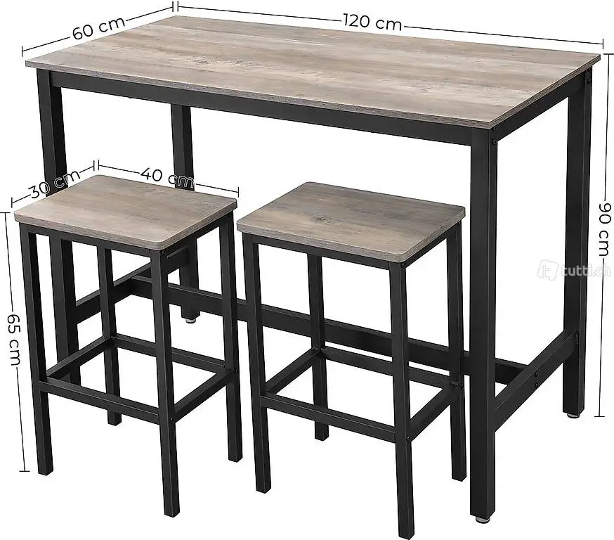 Küchentresen mit Barstühlen, Küchentisch und Küchenstühle im Industrie-Design, für Küche, 120 x 60 x 90 cm, Greige-schwarz