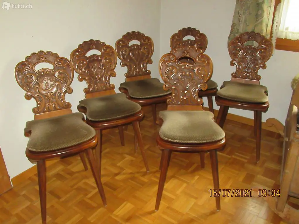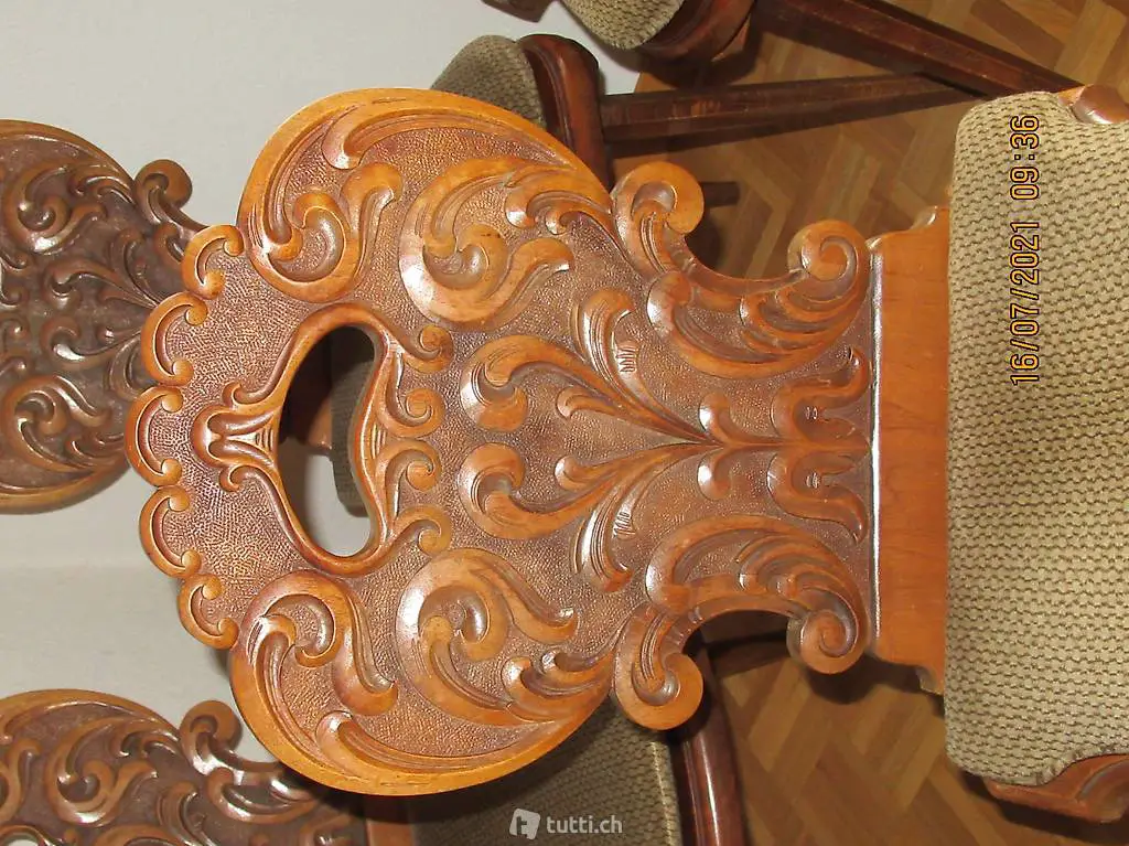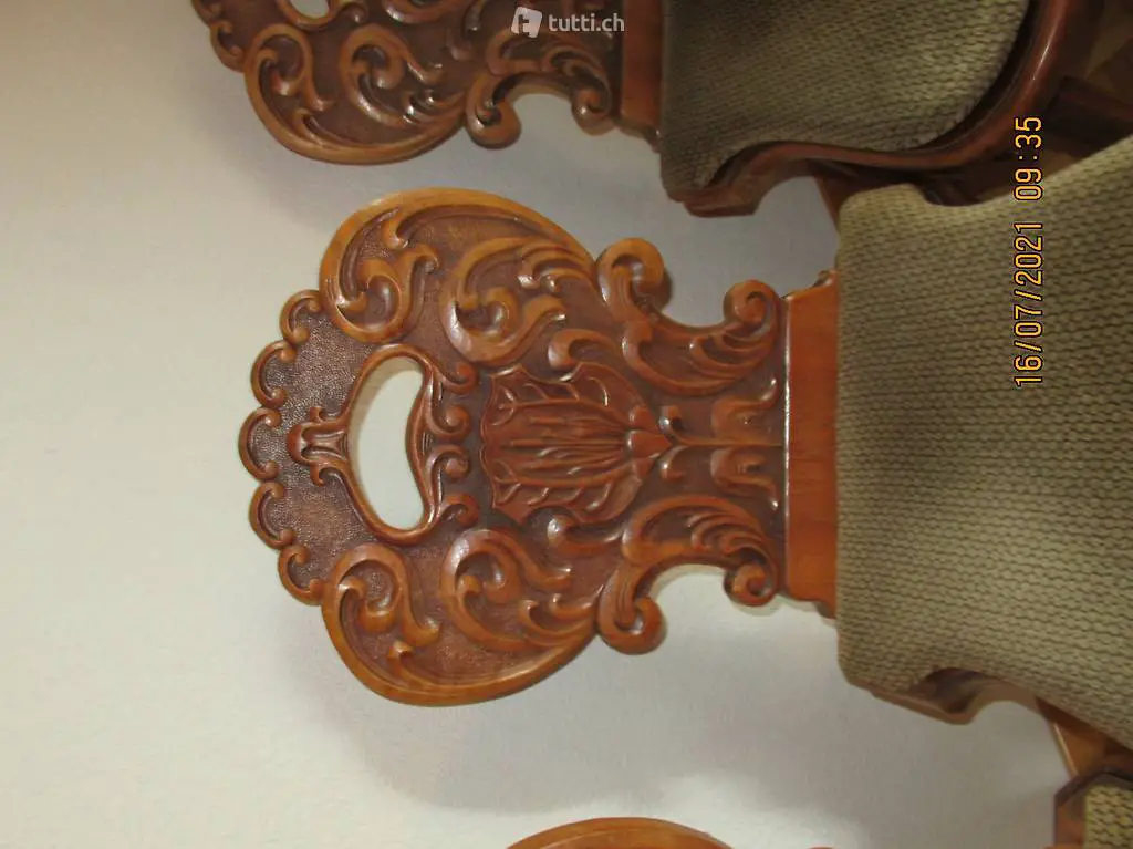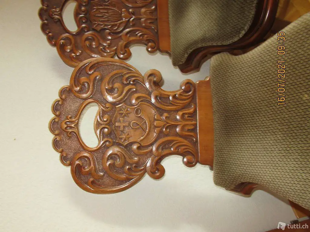 Schnitzerei, 4 mit gleicher Schnitzerei und 2 mit Familienwappen, nähere Angaben siehe Bilder, Zustand sehr gut, Masse Sitzhöhe 45 cm, Rückenende 87 cm,