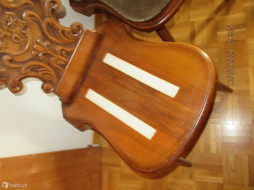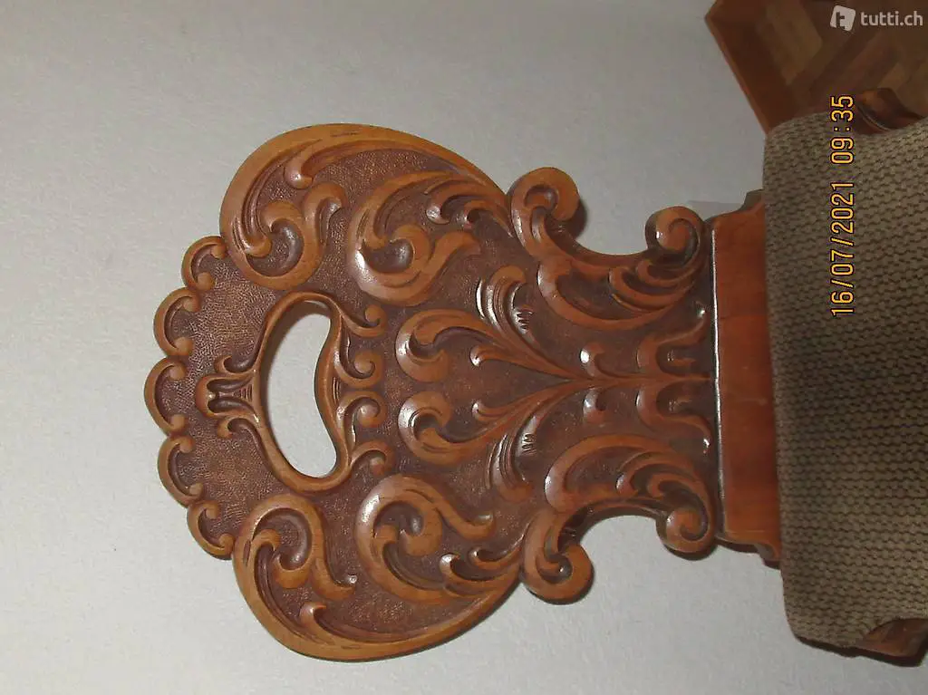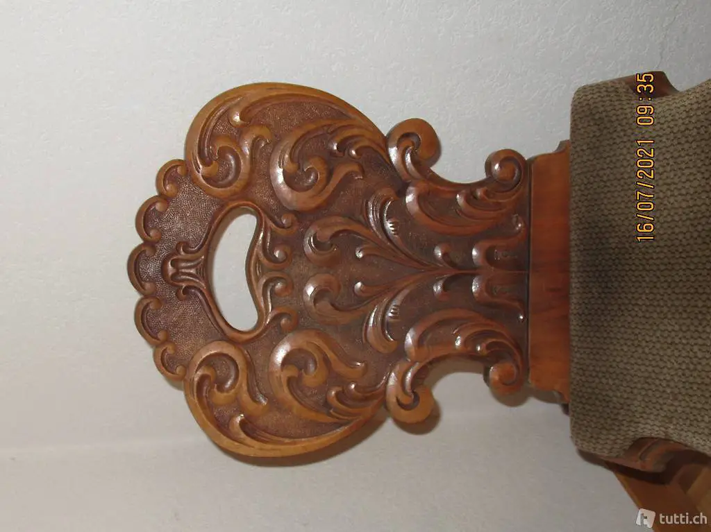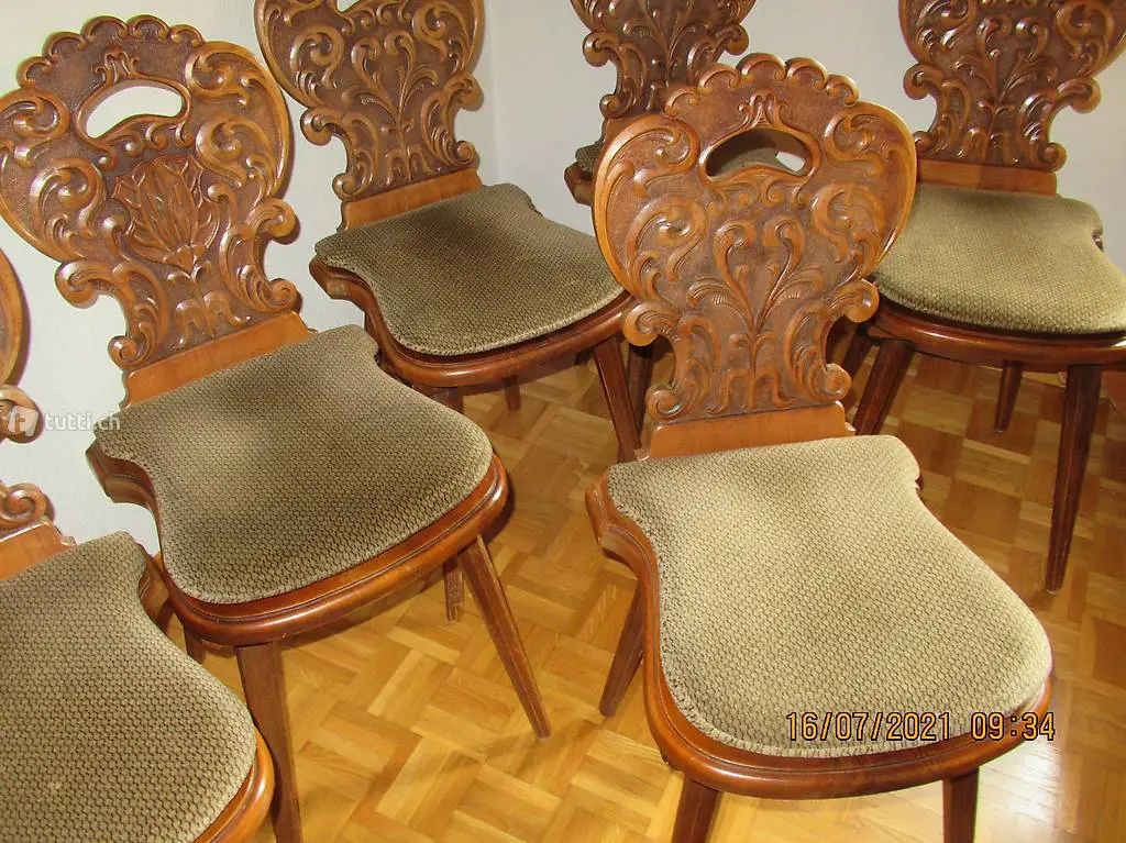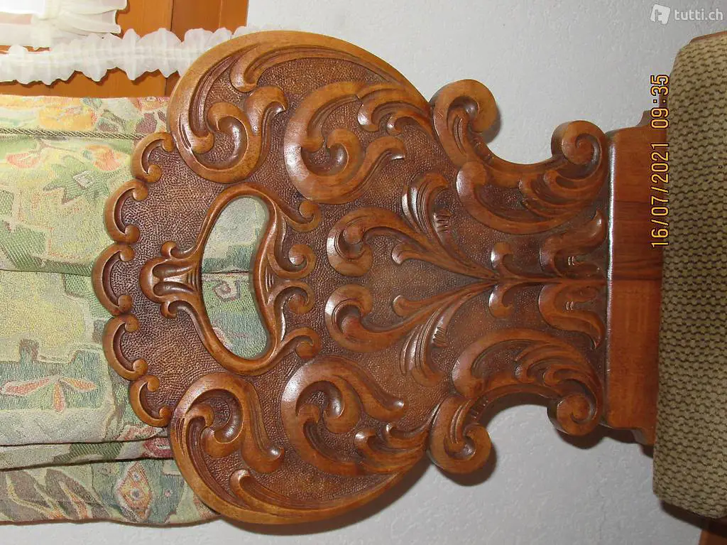 Schnitzerei, 4 mit gleicher Schnitzerei und 2 mit Familienwappen, nähere Angaben siehe Bilder, Zustand sehr gut, Masse Sitzhöhe 45 cm, Rückenende 87 cm,