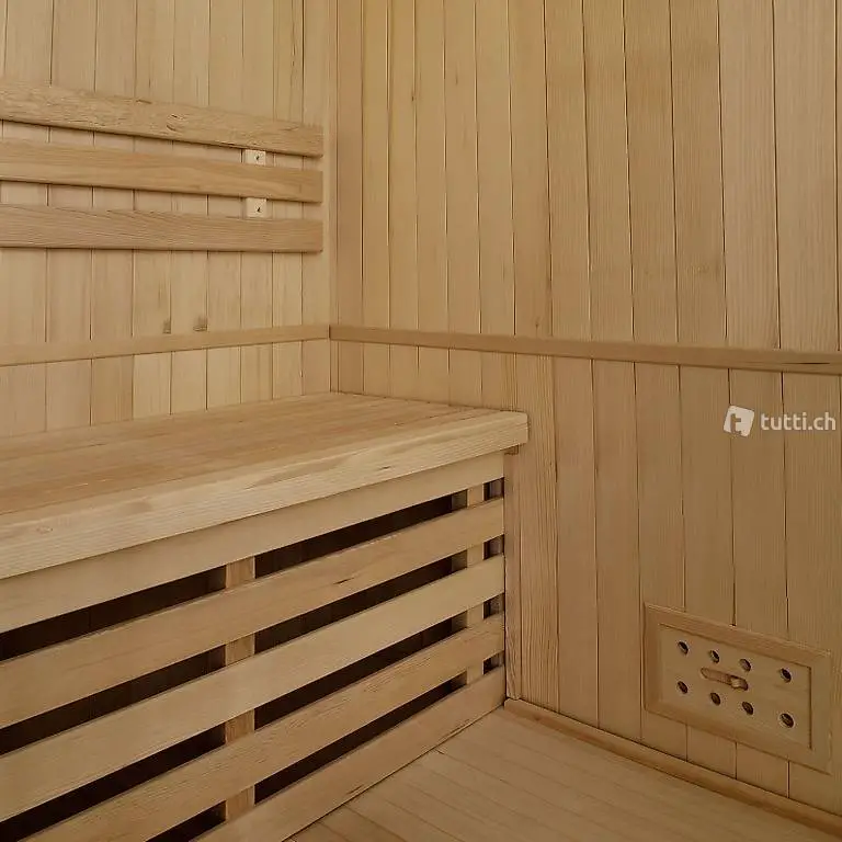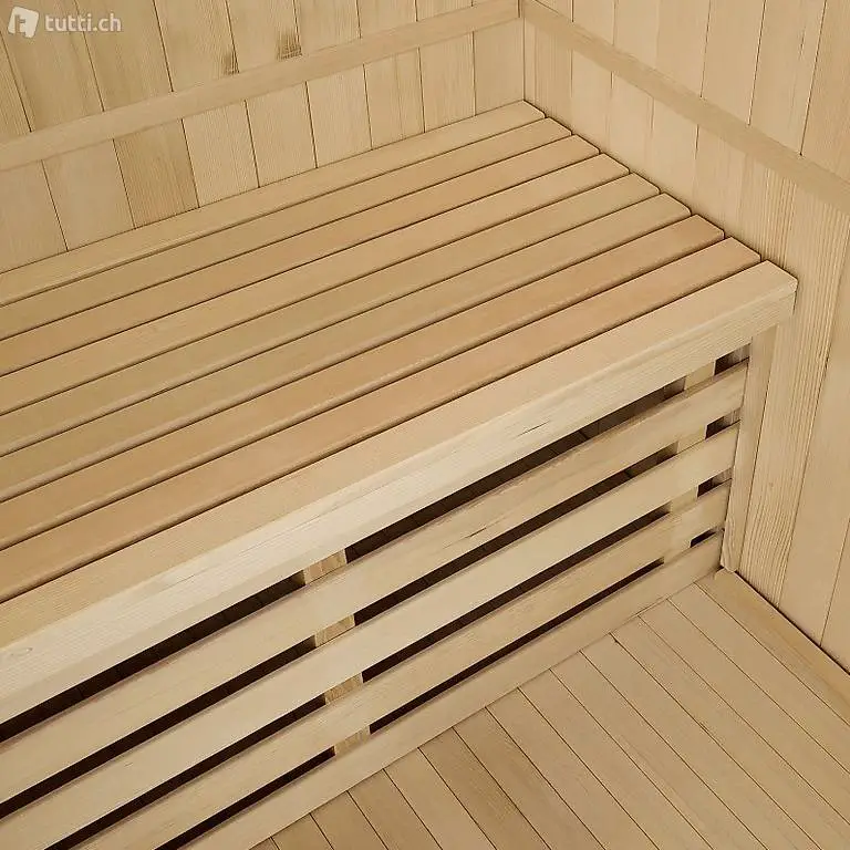Die grosse integrierte Holzbank bietet für bis zu zwei Personen einen bequemen Sitzplatz. Mit einem Stellmass von 150 x 110 cm bleibt die Saunakabine eine platzsparende Angelegenheit. Schaffe auch dir deine eigene kleine Wellness-Oase für Zuhause.