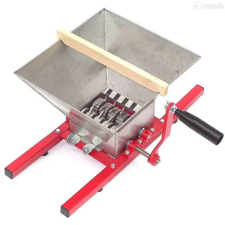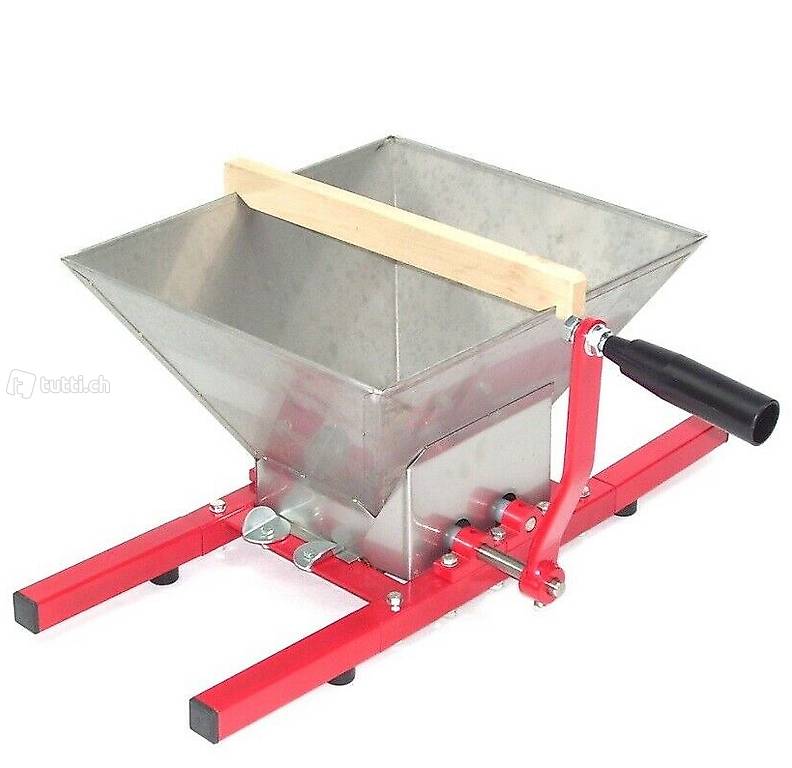 Obst und Beerenmühle mit manuellem Antrieb und beidseitig angetriebenem Mahlwerk.