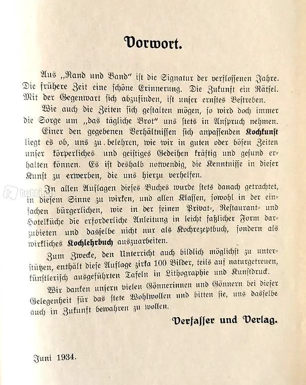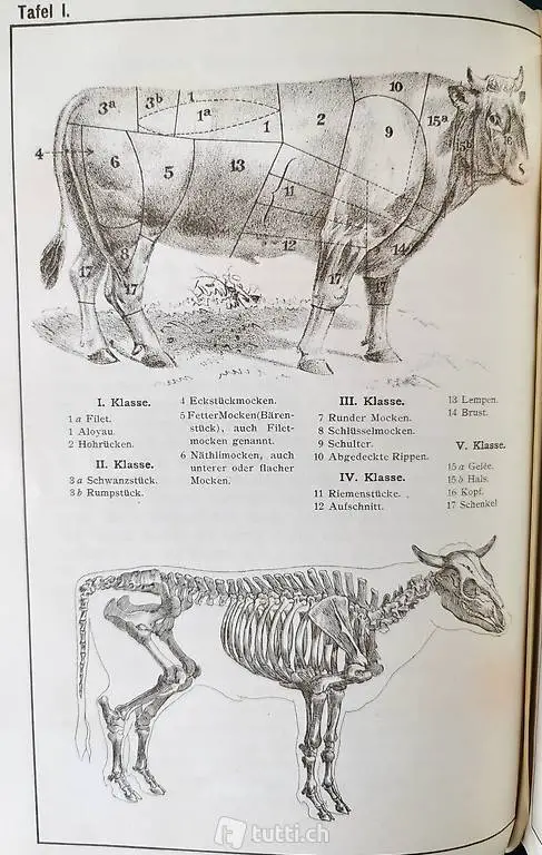 Kochbuch aus dem Jahre 1934, gut erhalten mit 656 Seiten. 8 farbige Bilderblätter über Fleischteile von Kühen, 2 Bilderblätter über Geflügel, 4 Bilderblätter über Fische, 4 farbige Bilderblätter über Pilze. Verkaufspreis dem Höchstbietenden