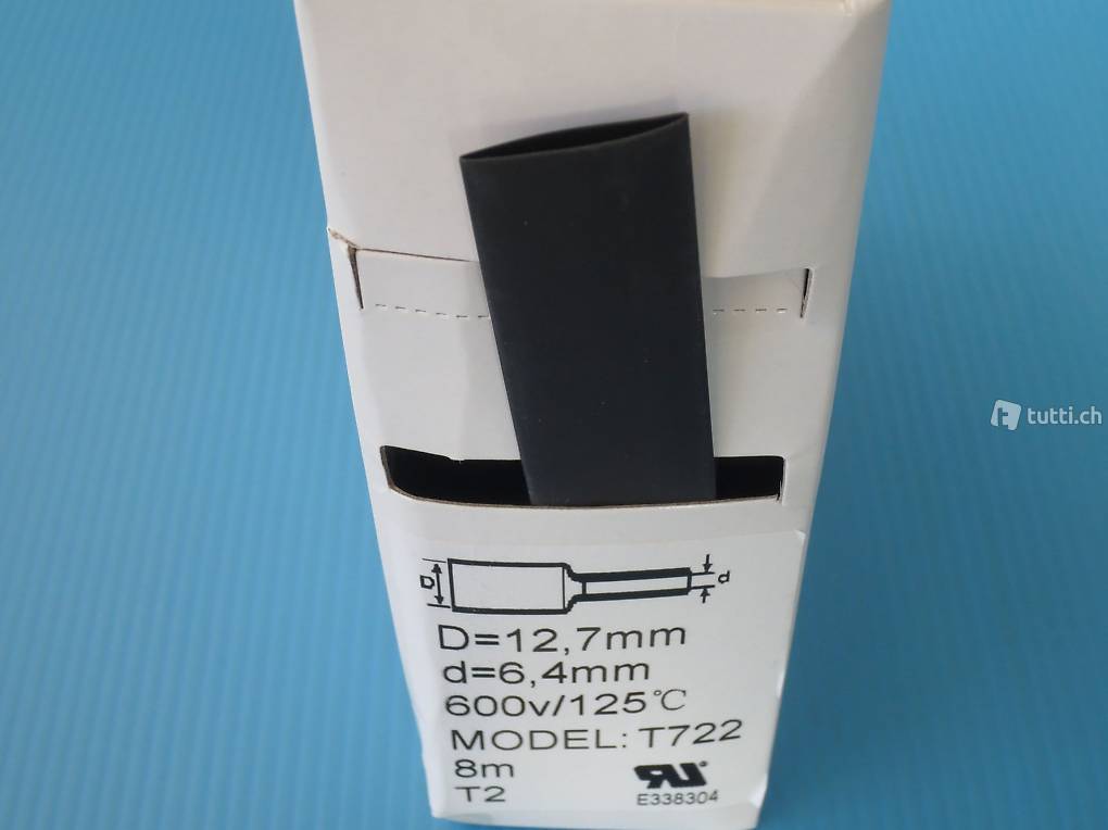 Sie sehen hier eine neue Schrumpfschlauch Box mit 8 Meter schwarzen Schrumpfschlauch. Der Schrumpfschlauch hat vor der Schrumpfung einen Durchmesser von 12,7mm und kann bis auf 6,4mm geschrumpft werden.