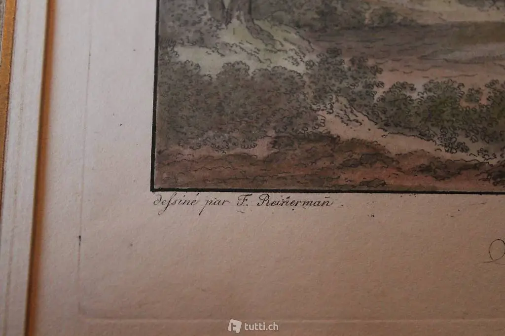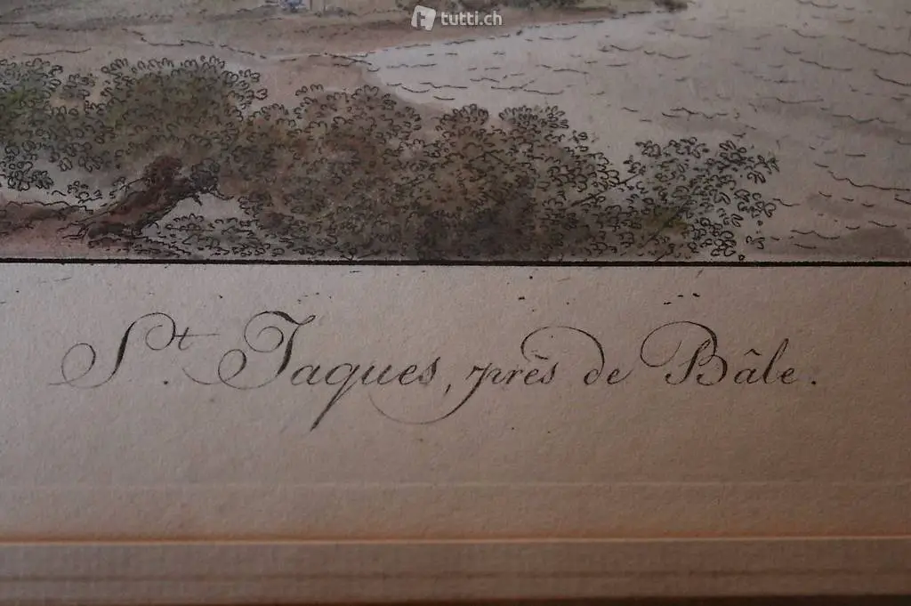 Verkaufe alten kolorierten Stich von St. Jaques près de Bâle, Friedrich Christian Reinermann 1764-1835. Die Bildgrösse beträgt 14 x 20 cm und der Rahmen 31 x 36 cm. Das Bild ist eingerahmt aber das Glas fehlt. Der schöne und goldverzierte Passepartout, rundet den Stich perfekt ab. Versand möglich, geht zu Lasten des Käufers.